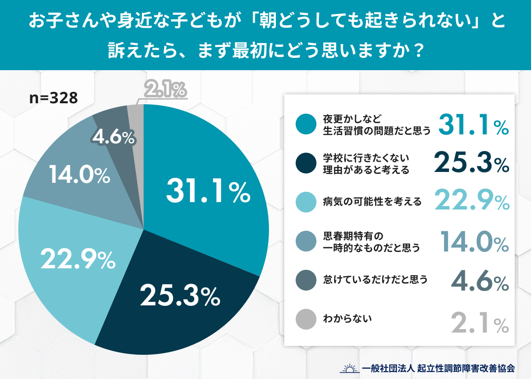 「朝起きられない=生活習慣の問題」と捉える保護者が31.1%。 「病気の可能性」を真っ先に考える人は2割強に留まる