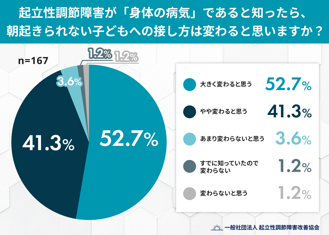 今回の調査により、起立性調節障害という「病名」は普及しているものの、その「実態」への理解が追いついていない現状が明確になりました。多くの保護者が、朝起きられない原因を本人の意思や生活習慣に求めてしまいがちですが、それが「身体の疾患」であると認識されれば、9割以上が接し方を変えたいと考えています。子どもたちが「怠けている」という誤解によって傷つき、二次的な精神疾患を抱える前に、正しい知識を社会に広めることが何より重要です。