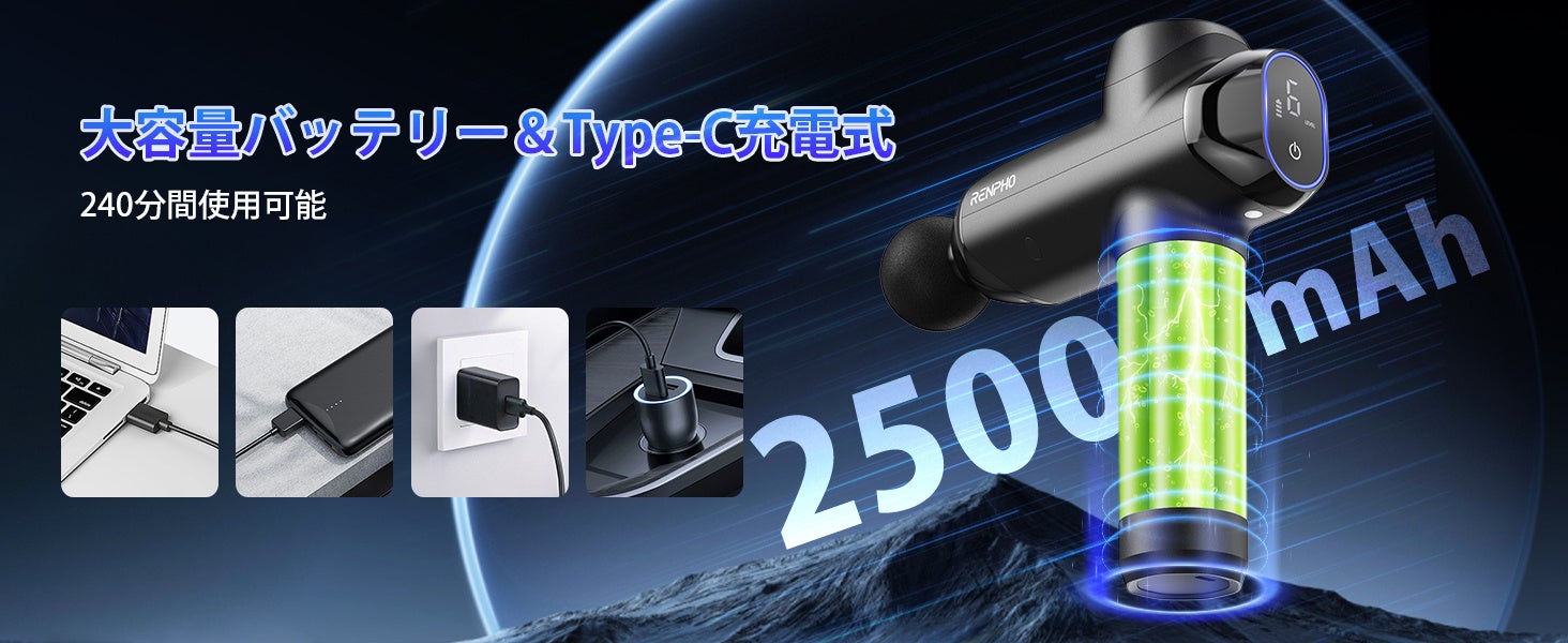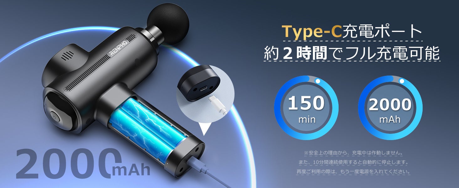 2500mAhの大容量バッテリーを搭載し、Type-C充電ケーブルで充電可能、フル充電で最大4時間の使用が可能です。使用時間の目安として、1回につき10分程度が最適、10分後自動的にオフになります。