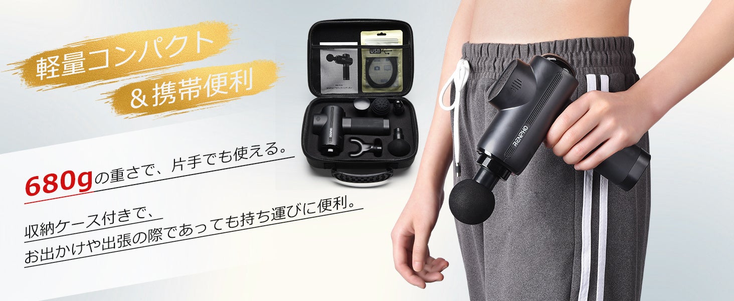 本体サイズ:18.6*14.7*6cm、本体の重さは680gで、長時間持っても疲れにくい超軽量設計のため、女性にもおすすめです。収納バック付きで、旅行、出張の際の持ち運びにも非常に便利です。『Powerハンディガン』と同レベルの、100W出力強力ブラシレスモーターを搭載し、ヘッドストロークは10MMを実現。使用中に強く押し付けても止まりにくい設計です。更に45㏈の低騒音を実現、夜でも安心してご使用いただけます。