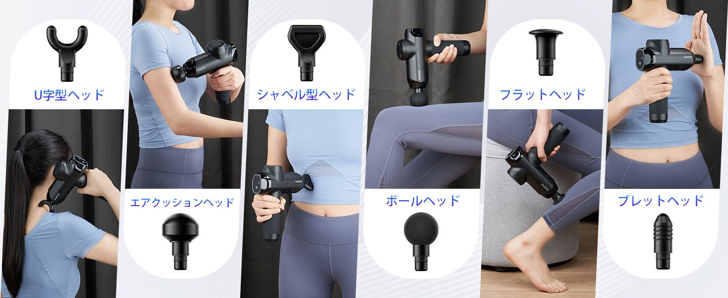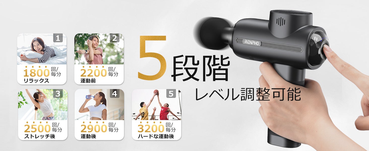 振動レベルは1800RPMから3200RPMまで5段階調整可能。使用時はお好みに合わせて自由に切り替え可能です。U字型、エアクッション型、ボール型、フラット型、ブレット型5種類のアタッチメント付属で、体のあらゆる部位にしっかりフィットします。