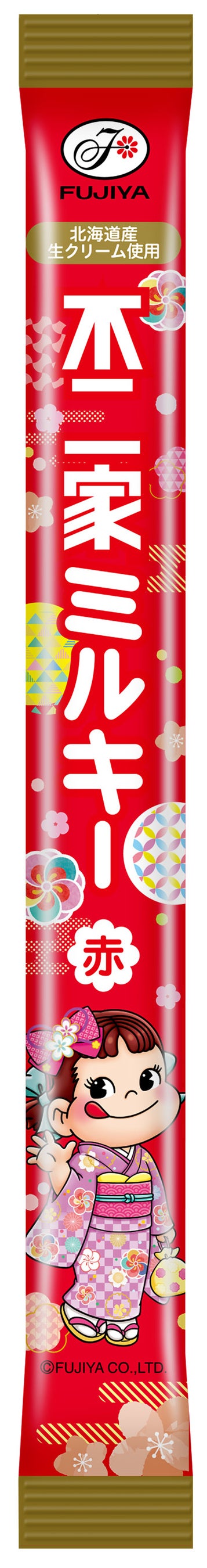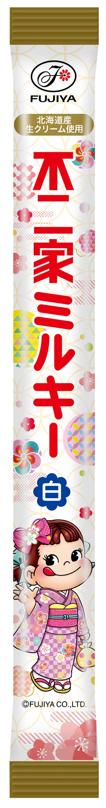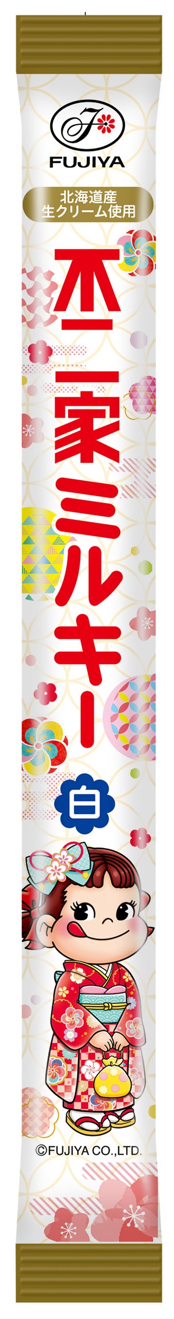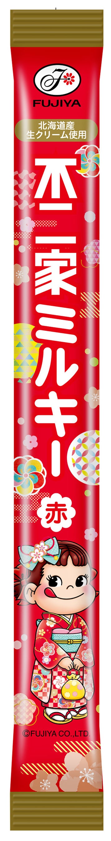 七五三定番の「千歳飴(赤)/(白)」は、それぞれ3種類の華やかな着物姿のペコちゃんデザインで登場。練乳と生クリームを使用し、不二家のロングセラーキャンディ「ミルキー」のような濃厚な味わいが楽しめます。千歳飴をイメージしたスティック型チョコ「ペコちゃんミルクチョコ」もございます。別売りの「千歳飴詰め合わせ袋(ペコポコ)」は2種類のサイズをご用意。お宮参りや記念撮影など、お子様の年齢に合わせてお使いいただけます。