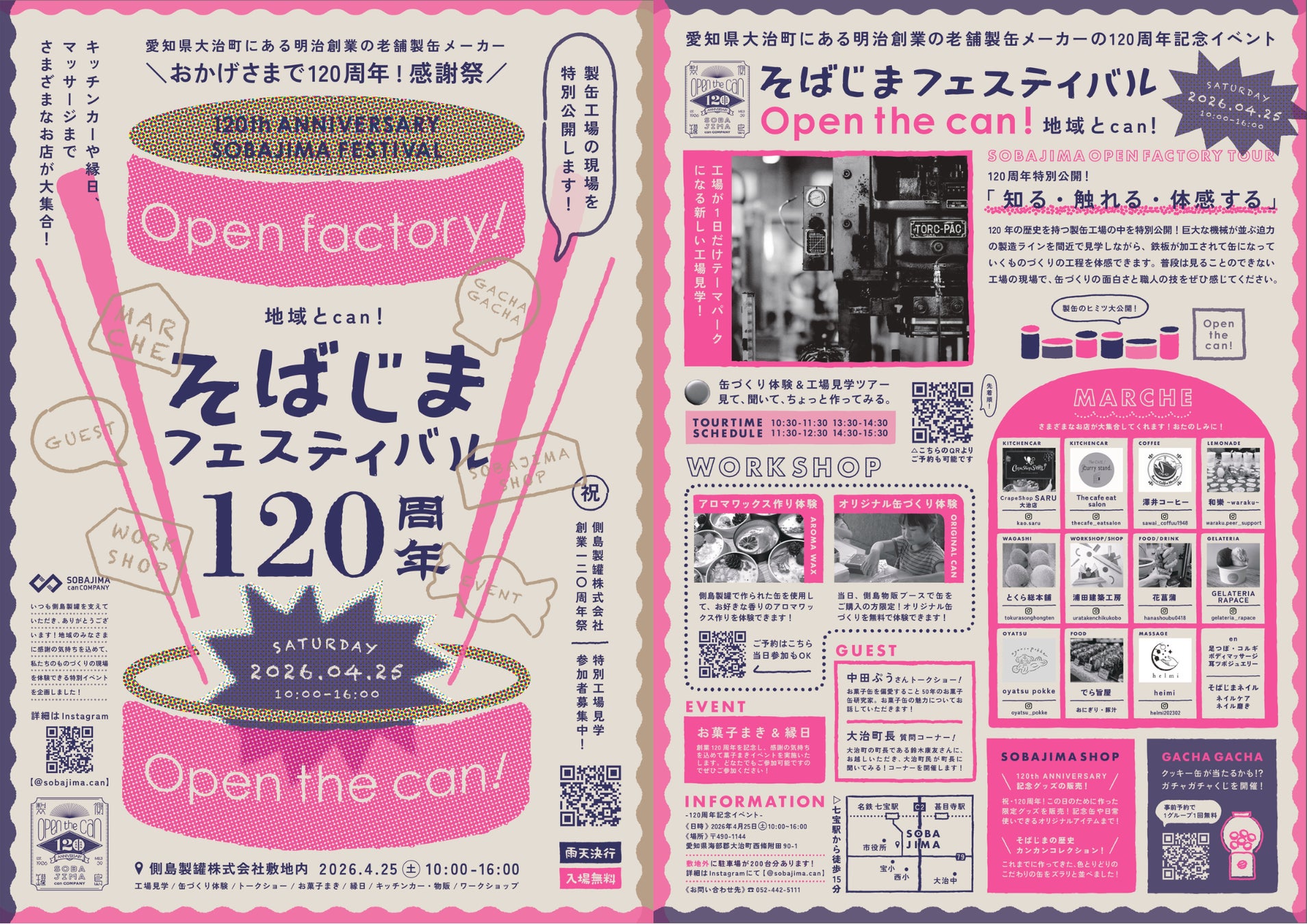 明治39年創業の缶メーカー、側島製罐株式会社(本社:愛知県海部郡大治町、代表取締役:石川 貴也、以下「側島製罐」)は、創業120周年を記念して初のオープンファクトリーイベント「そばじまフェスティバル」を、2026年4月25日(土)に会社敷地内にて開催いたします。