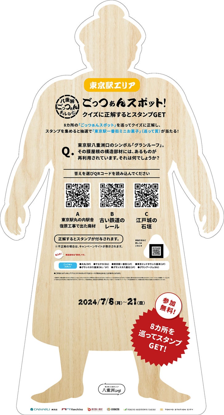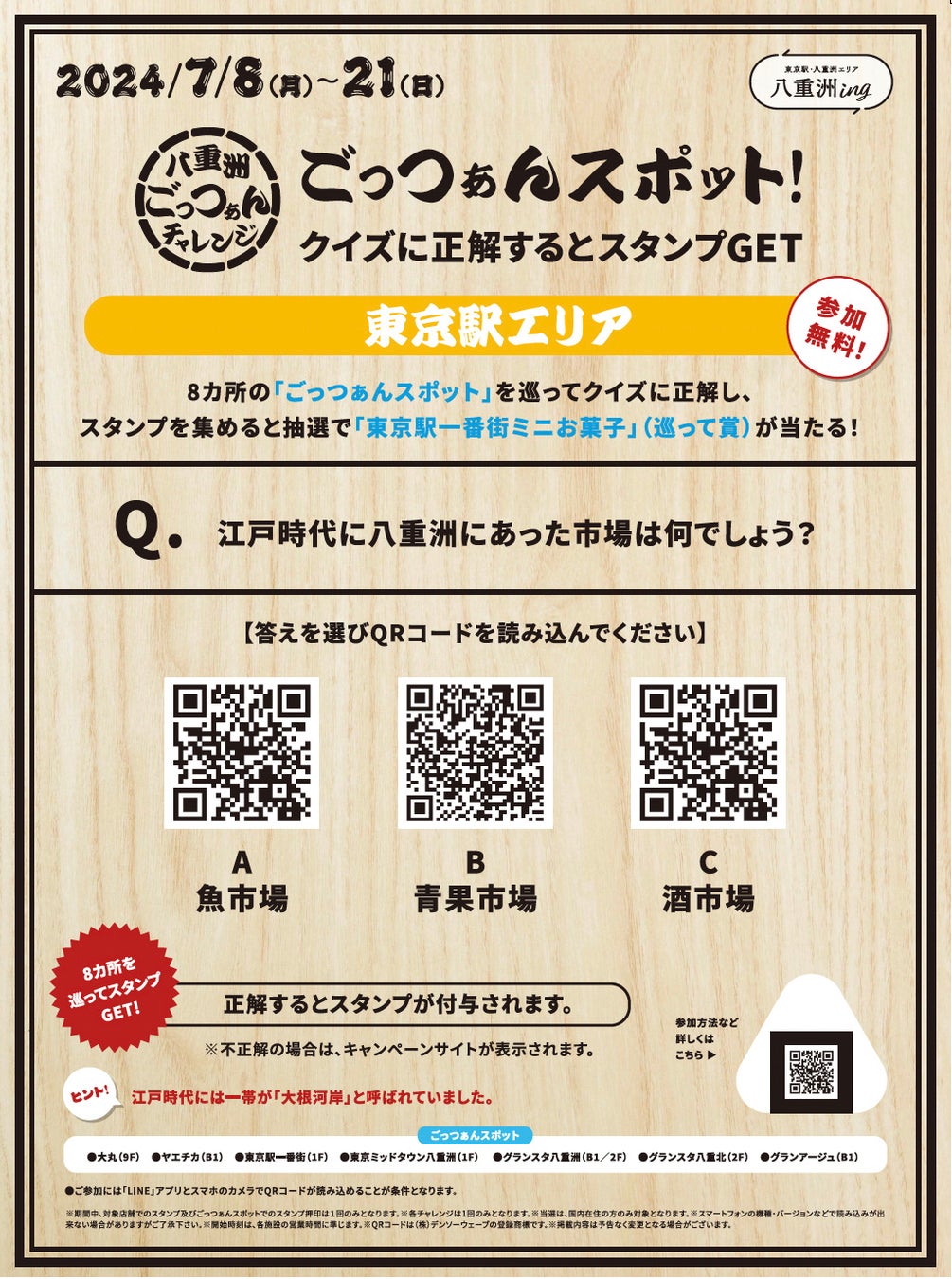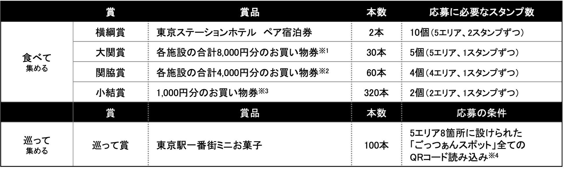 期間中、大丸エリア・ヤエチカエリア・東京駅一番街エリア・ 東京ミッドタウン八重洲エリア・東京駅エリア(グランスタ八重北・グランスタ八重洲・グランアージュ)の5エリアの対象店舗でのご飲食やお買い物でスタンプを集めると、抽選で宿泊券やお買い物券が当たります。または、5エリア内に8カ所設けられた「ごっつぁんスポット」で、全てのQRコードを読み込むと、抽選で「巡って賞」が当たります。