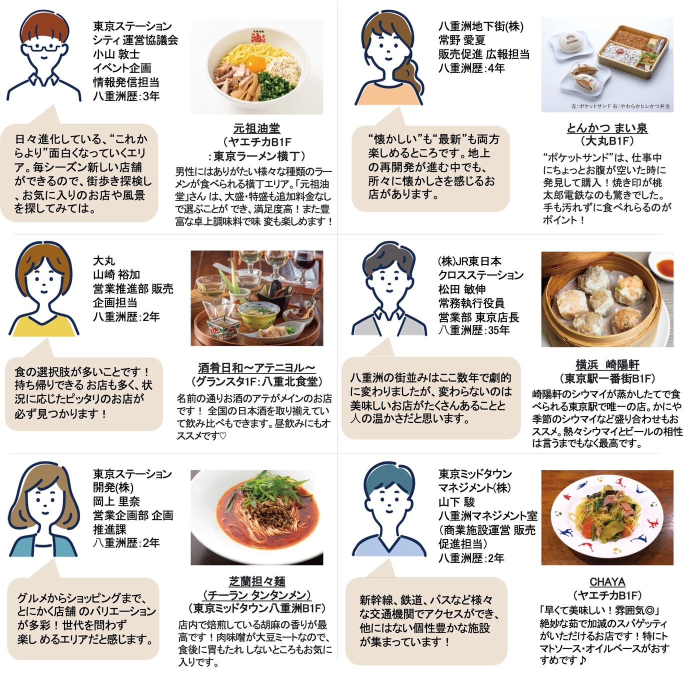 八重洲エリアにはバラエティ豊かな飲食店が立ち並んでいます。今回は、八重洲エリアの各施設担当が実際に通う、他の施設のおすすめのお店をご紹介します。 「八重洲ごっつぁんチャレンジ!LINEスタンプラリー」と合わせてお気に入りのお店をみつけてみてはいかがでしょうか。また、日々進化する八重洲を間近に見ているからこそ感じる八重洲エリアの魅力もご紹介します。