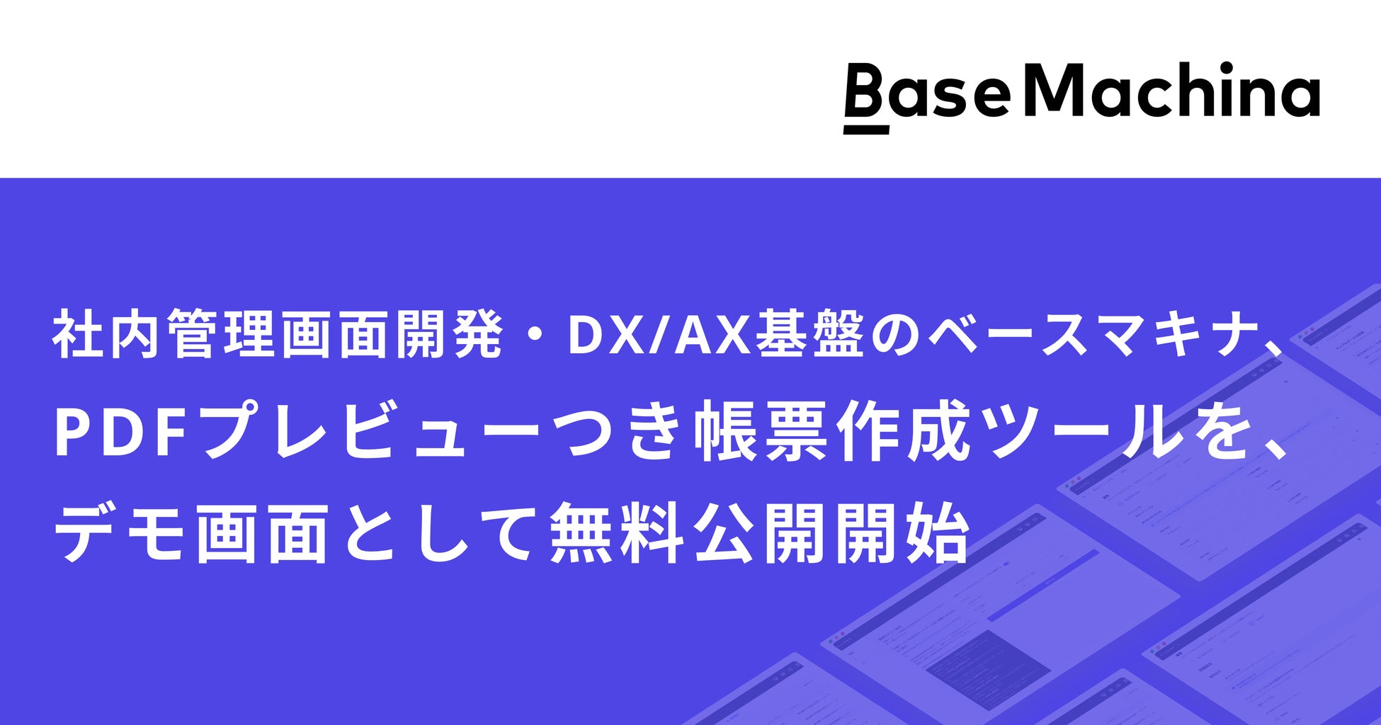 Web事業者様の社内管理画面をはじめとして、社内のERP補完・リプレイスなどにも使えるDX/AX基盤の「ベースマキナ」を提供する株式会社ベースマキナ(東京都中央区、代表取締役社長 髙橋誠二)は、PDFプレビューつきの「帳票作成ツール」をベースマキナのデモ画面として無料公開いたしました。