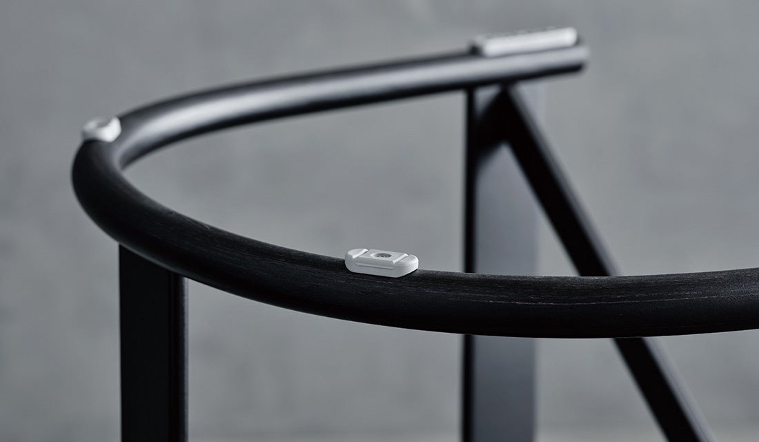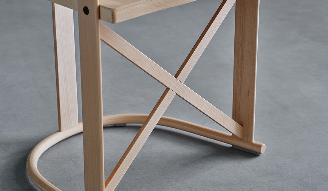 上部と下部のUの字の曲木はラミネート(貼り合わせ)することで曲げ加工をしており、一般的な無垢材を曲げる方法の曲げ木よりもロスの少ない工法を取り入れています。構成されるパーツも最小限に、タイムレスなデザインも魅力です。脚先には樹脂カバーが付いており、床材をカバーできるようになっております。