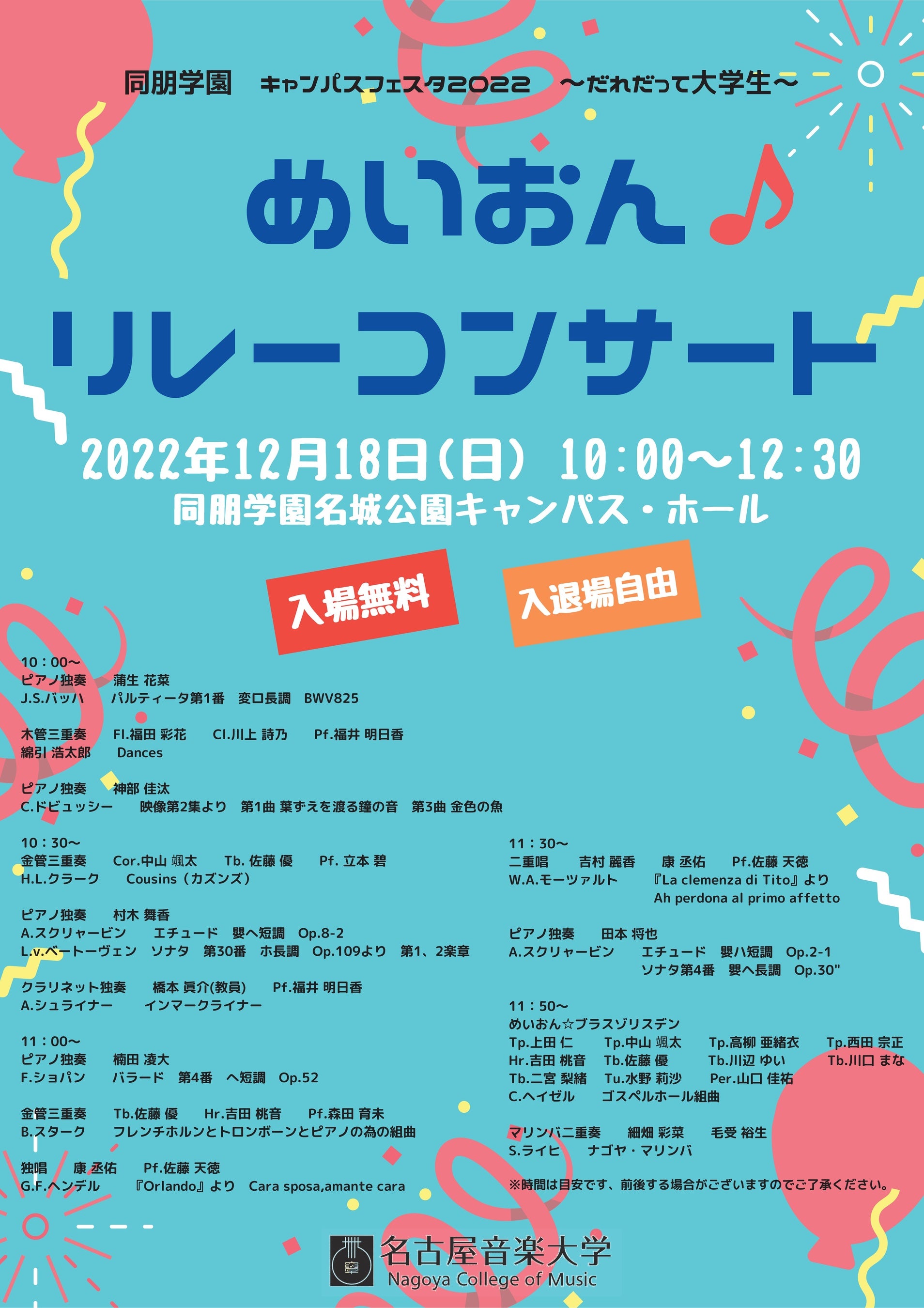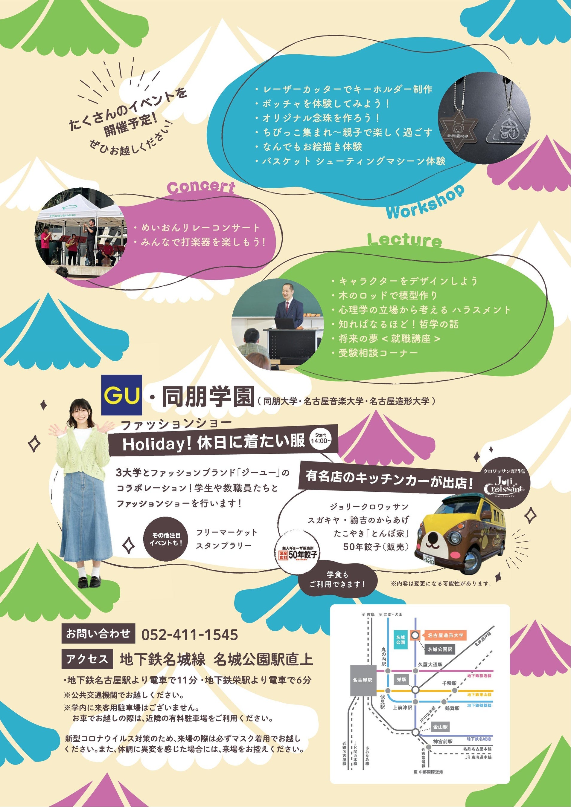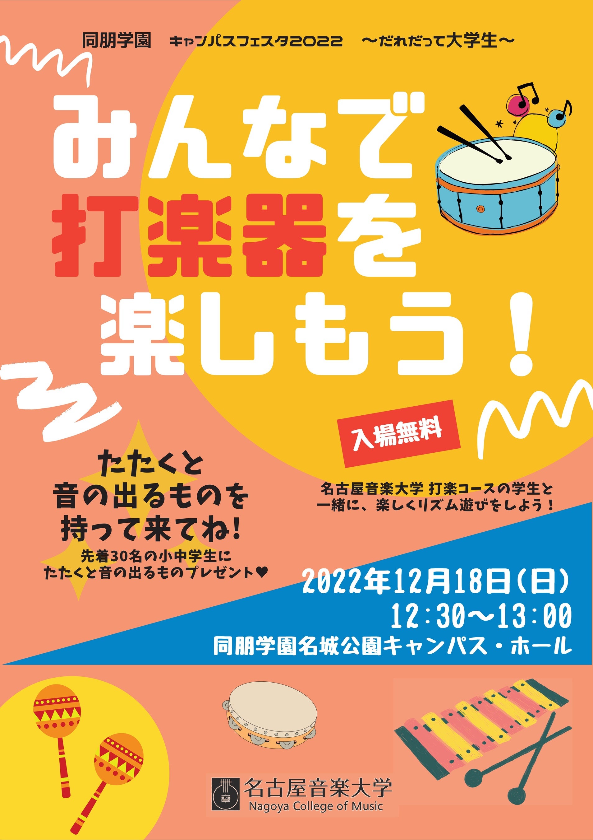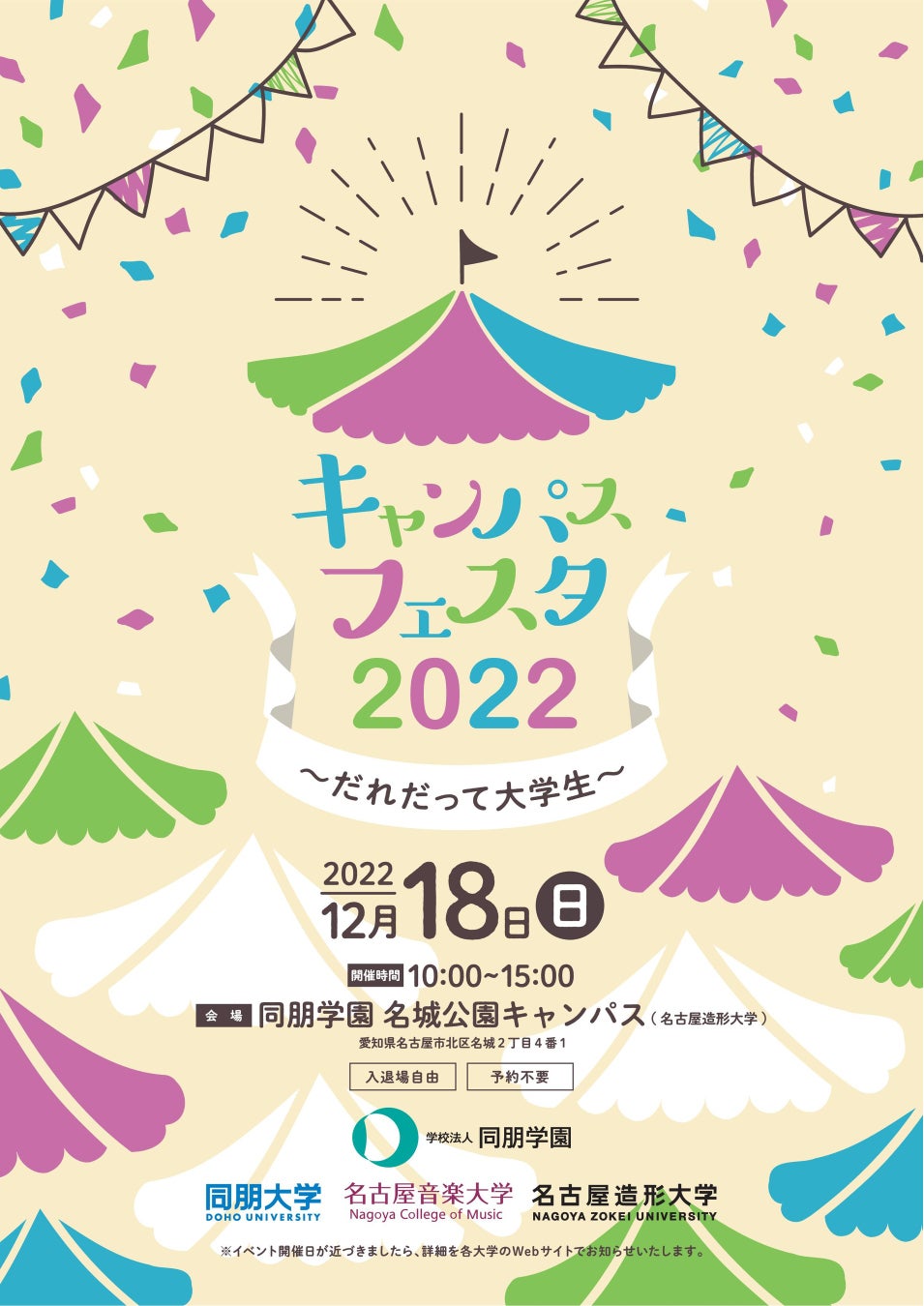 同朋学園(同朋大学・名古屋音楽大学・名古屋音楽大学)キャンパスフェスタ2022~だれだって大学生~を、2022年12月18日(日)に名城公園キャンパス(名古屋造形大学)にて開催。