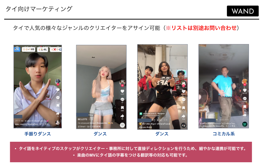 今回の提携により、WANDを通じたタイの楽曲を始めとする越境UGCマーケティングが強化され、より広範囲のユーザーにアプローチすることが可能になり、下記のようなジャンルでのアサインが可能となります。