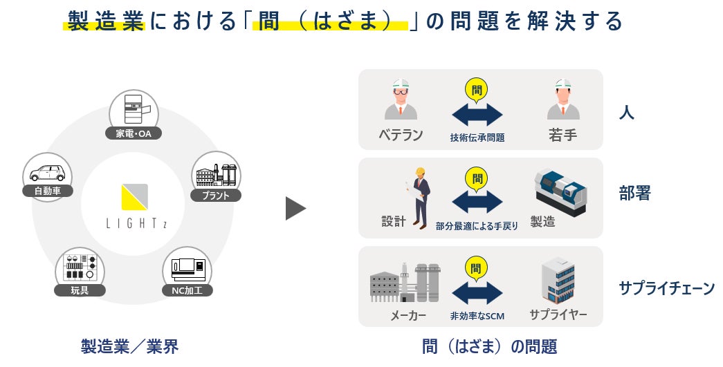 製造業において、「ベテラン社員と若手の間」、「設計と製造の間」、「メーカーとサプライヤーの間」には、複雑に絡み合った問題が多数存在しています。LIGHTzはそれらの問題解決をミッションとし、独自技術である、「汎知化」技術や「ブレインモデル」テクノロジーを活用し、多数の企業を支援してまいりました。