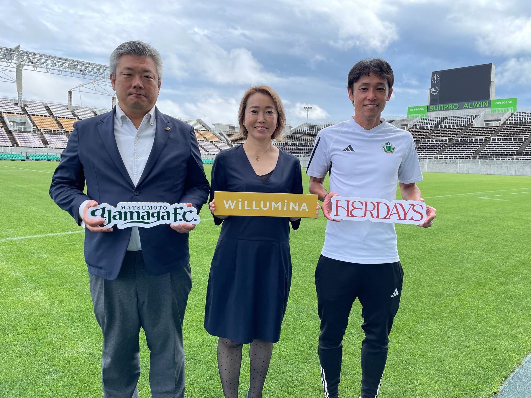 (写真左から)NPO法人松本山雅スポーツクラブ 理事長 柄澤深様、株式会社ウィルミナ 代表取締役 幸村潮菜、松本山雅FCレディース 監督 小林陽介様