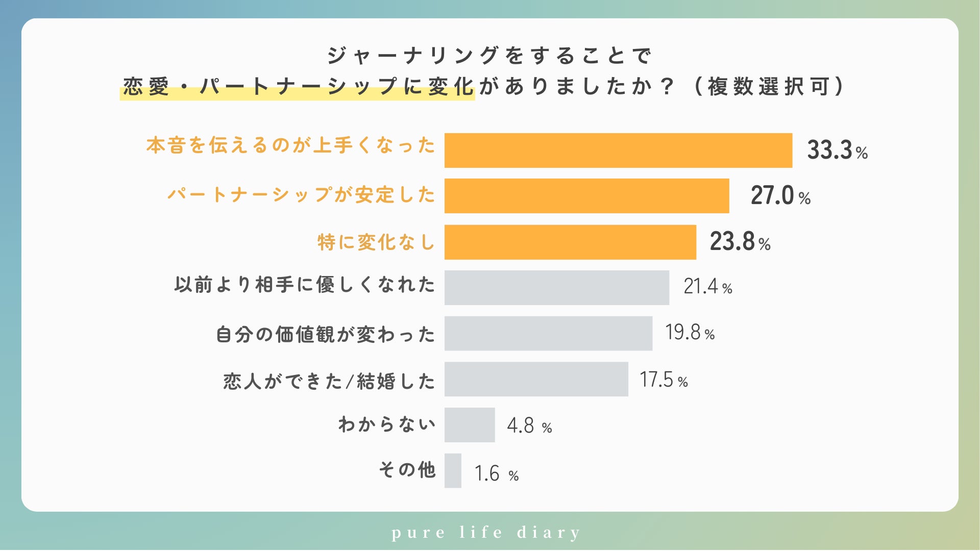 ジャーナリング実践者の恋愛への影響1位は「本音を伝えるのが上手くなった」(33.3%)。