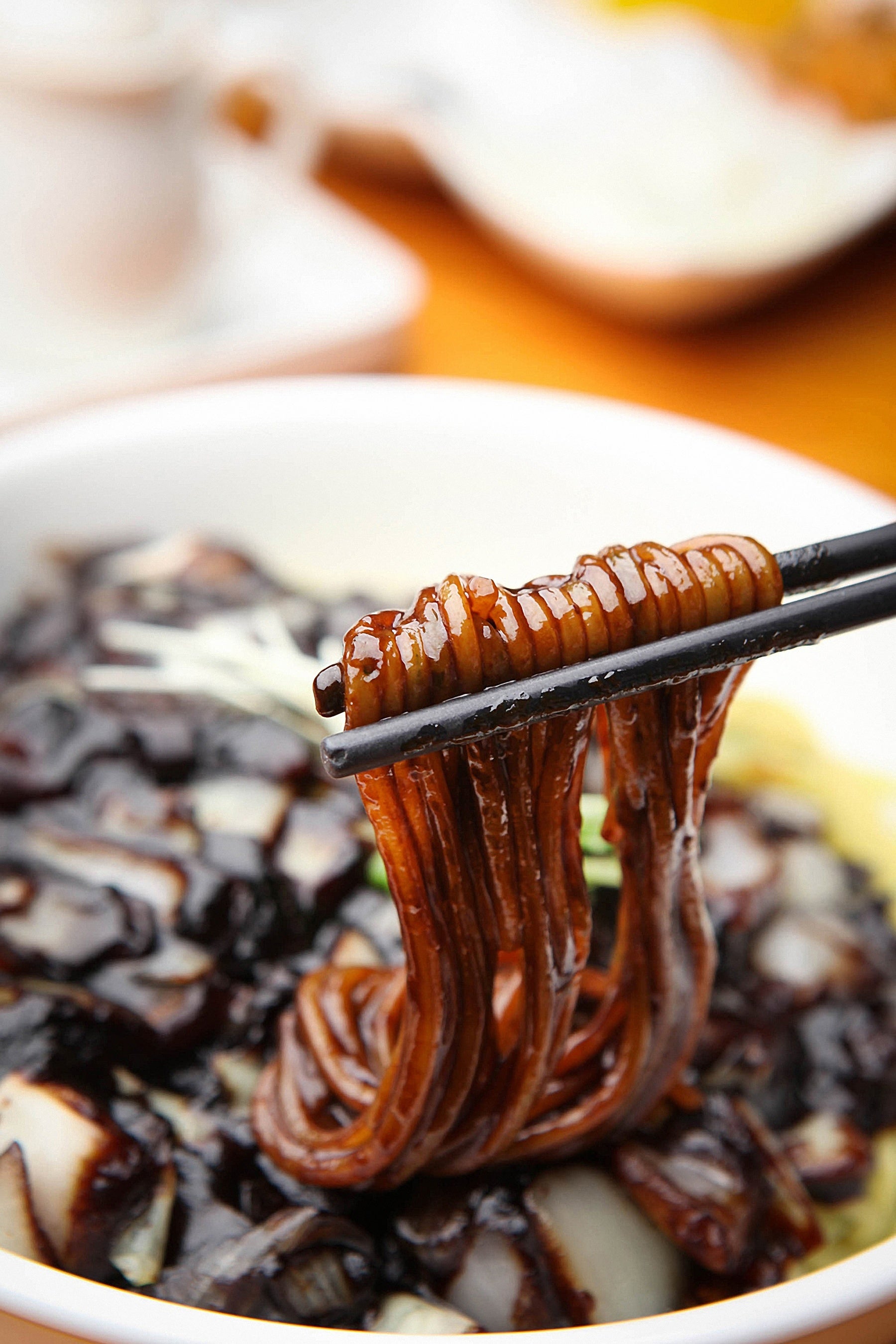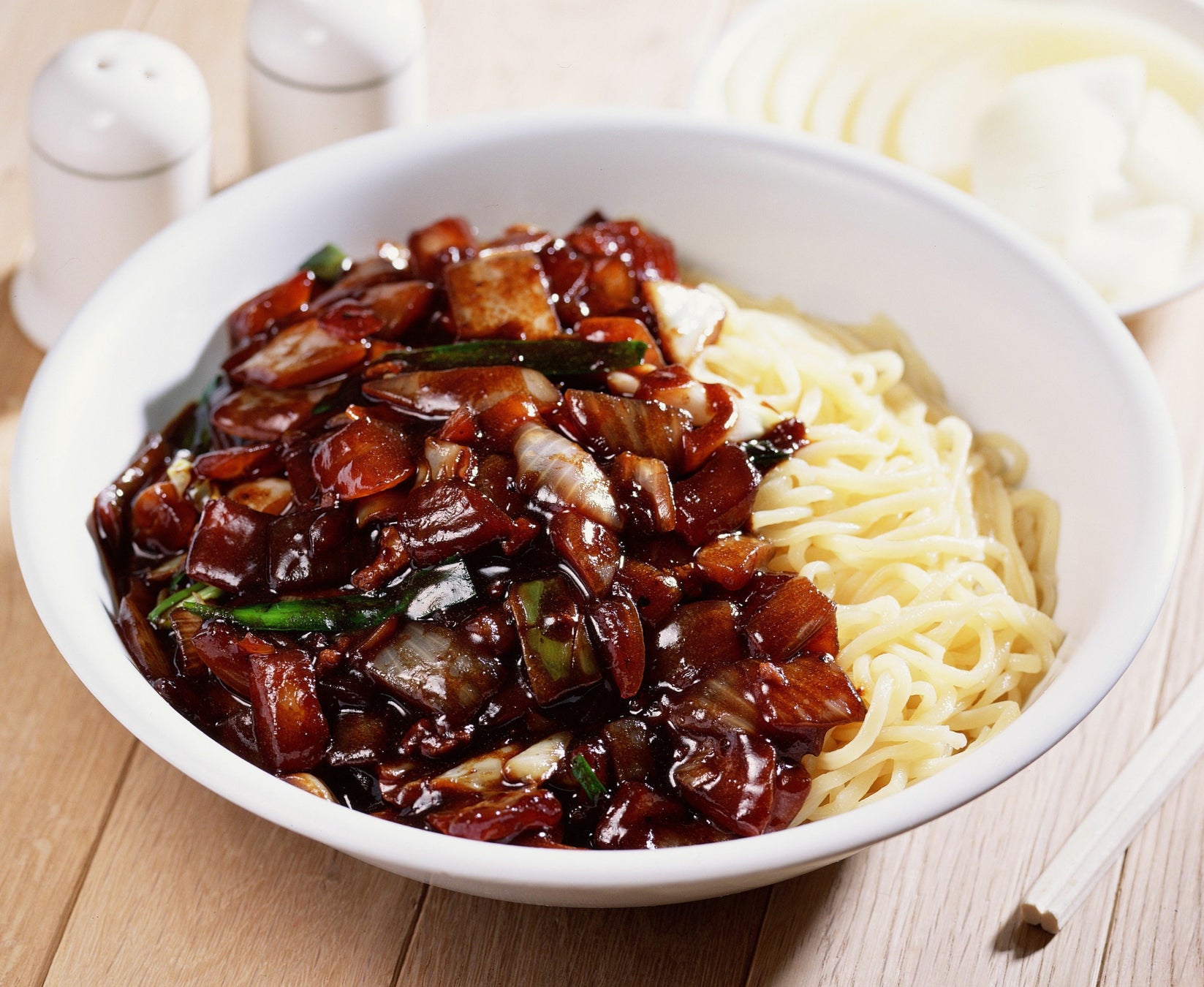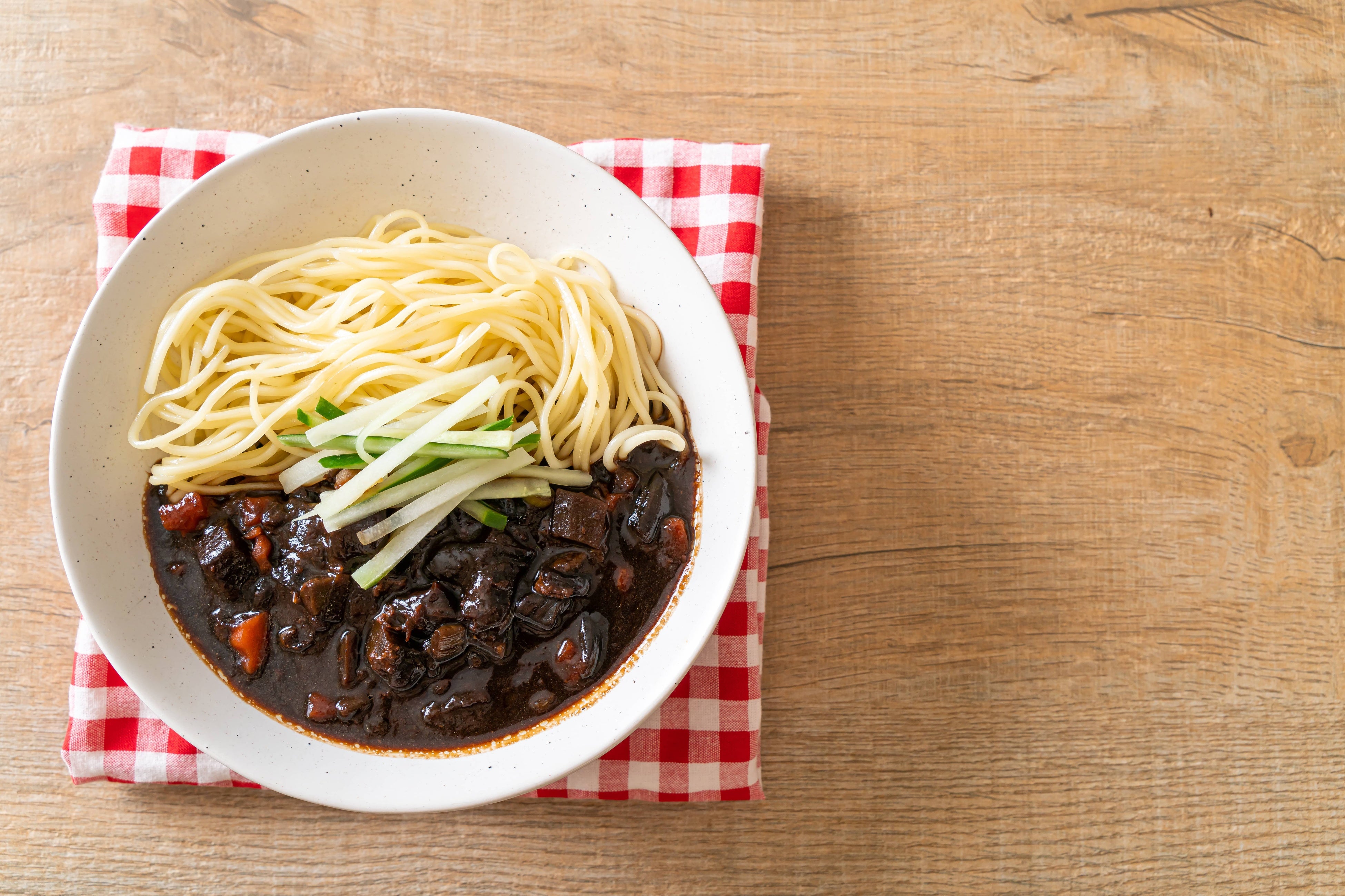 もともと炸醤麺(ジャージャン麺)は、中国発祥の家庭料理として広まり、各国の好みにより少しずつ変化していった料理です。中国では、甘辛くてコクのある甜麺醤(テンメンジャン)を使っているのに対し、韓国では春醤(チュンジャン)と呼ばれるカラメルを加えた黒味噌を使用しています。そのため、韓国風ジャージャン麺は日本や中国のものと比べ、強い黒色のソースが特徴です。