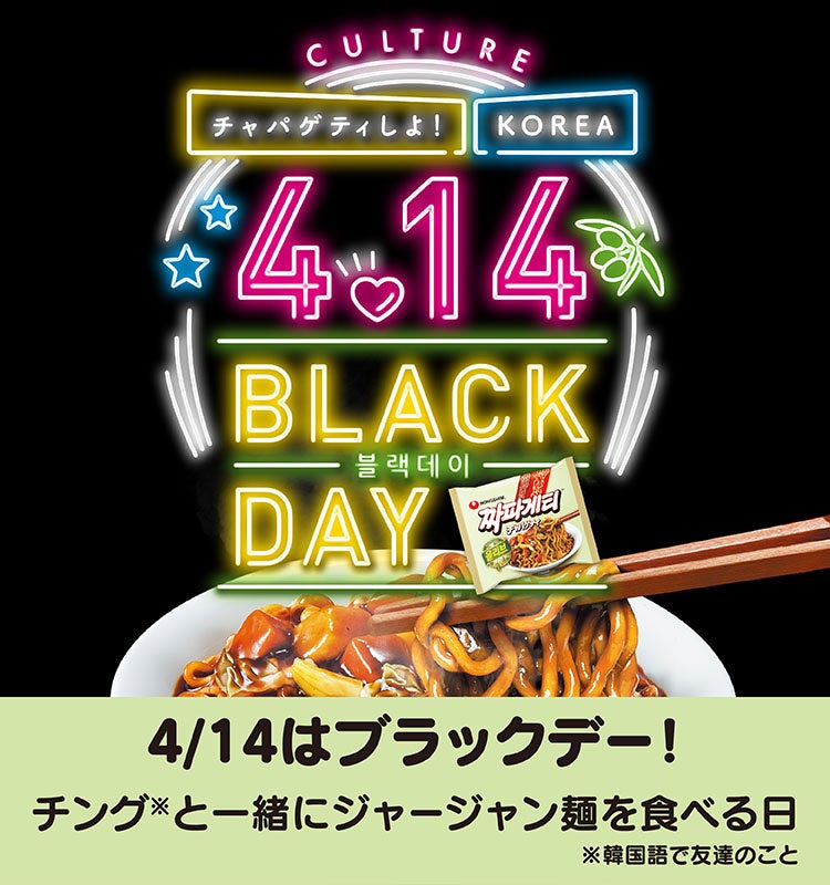 韓国において4月14日は「ブラックデー」と呼ばれ、2月14日のバレンタインデー、3月14日のホワイトデーに続く記念日として定着しています。恋人がいない男女が自虐的に黒い服を着て黒い食品を食べることから始まった同記念日ですが、現在では黒いソースのかかった韓国風ジャージャン麺を食べる日として親しまれています。
