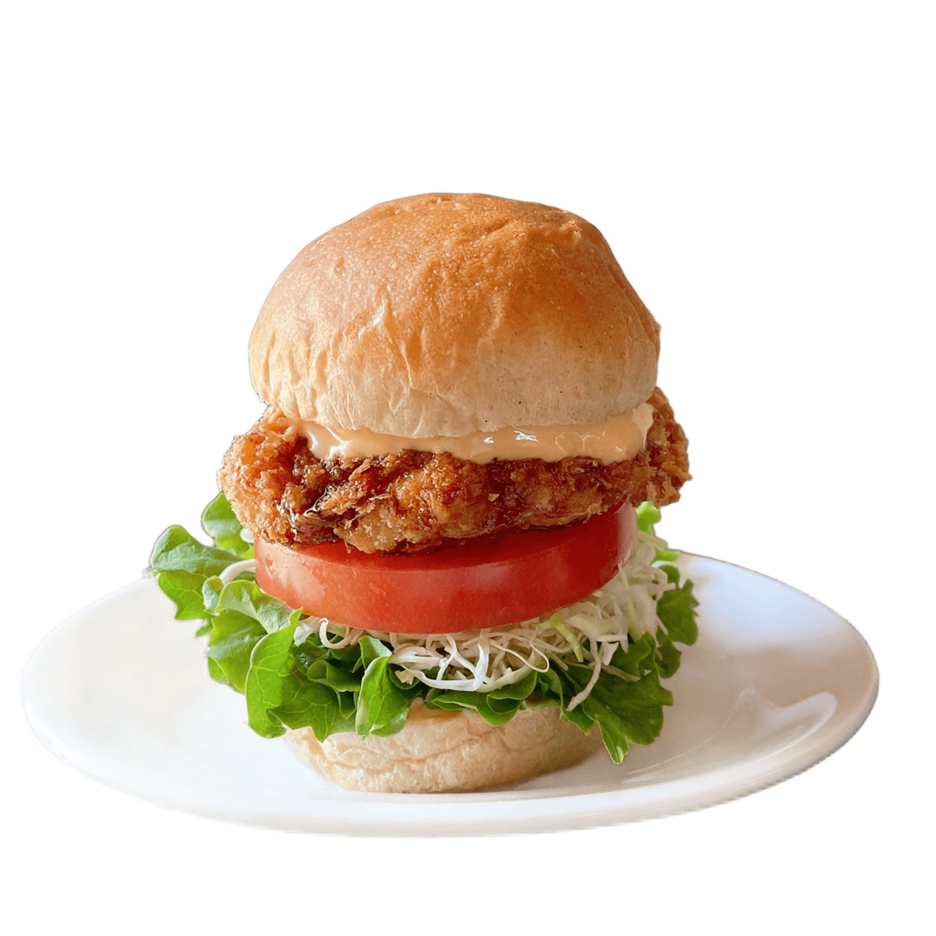大豆と米で作った生地を、生パン粉で包んで揚げた「かるカツ」。トマト・キャベツ・特製のソースとともに、こだわりのバンズで仕上げました。