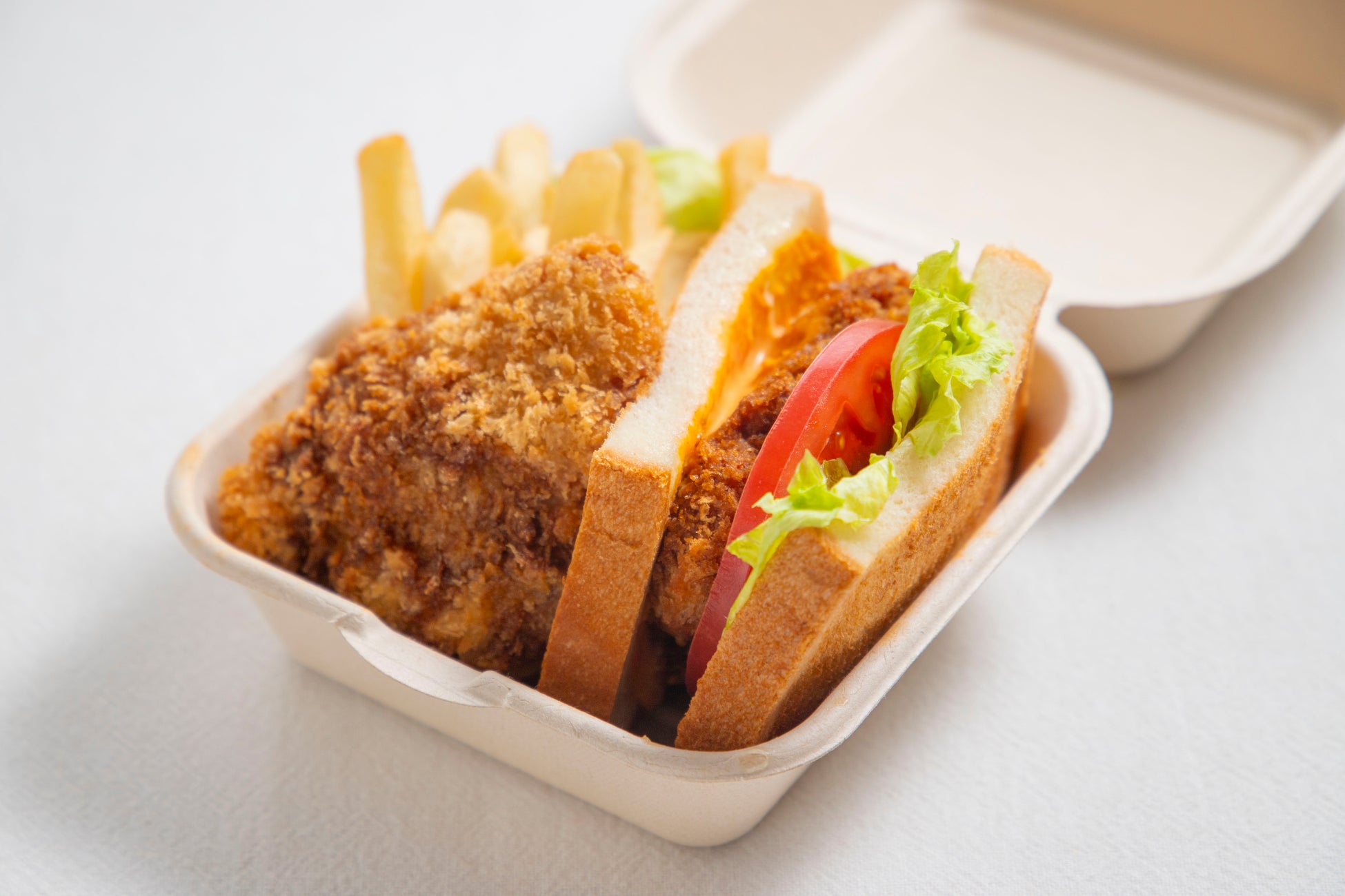 かるカツのサンドイッチに、2個目のかるカツ、シャキッとしたレタス、揚げたてポテトの組み合わせで満足感は抜群。