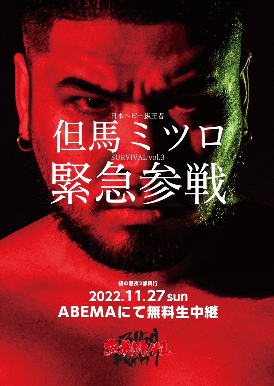 11月27日(日)に大阪・豊中市の176BOXにて行われる「3150FIGHT SURVIVAL vol.3」に、日本ヘビー級王者・但馬ミツロ(KWORLD3)の追加参戦が決定した。