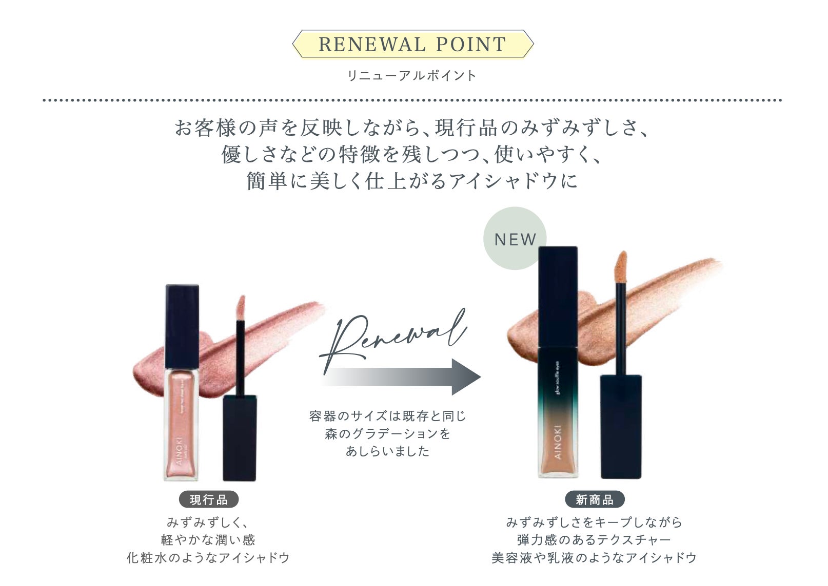 人気のシアーリキッドが、目元に彩りと輝きを与えるスフレアイシャドウとして、パワーアップリニューアル。くすまず、よれない仕上がりに。5月5日[月]よりAINOKI公式HP、インスタグラムにて先行予約開始