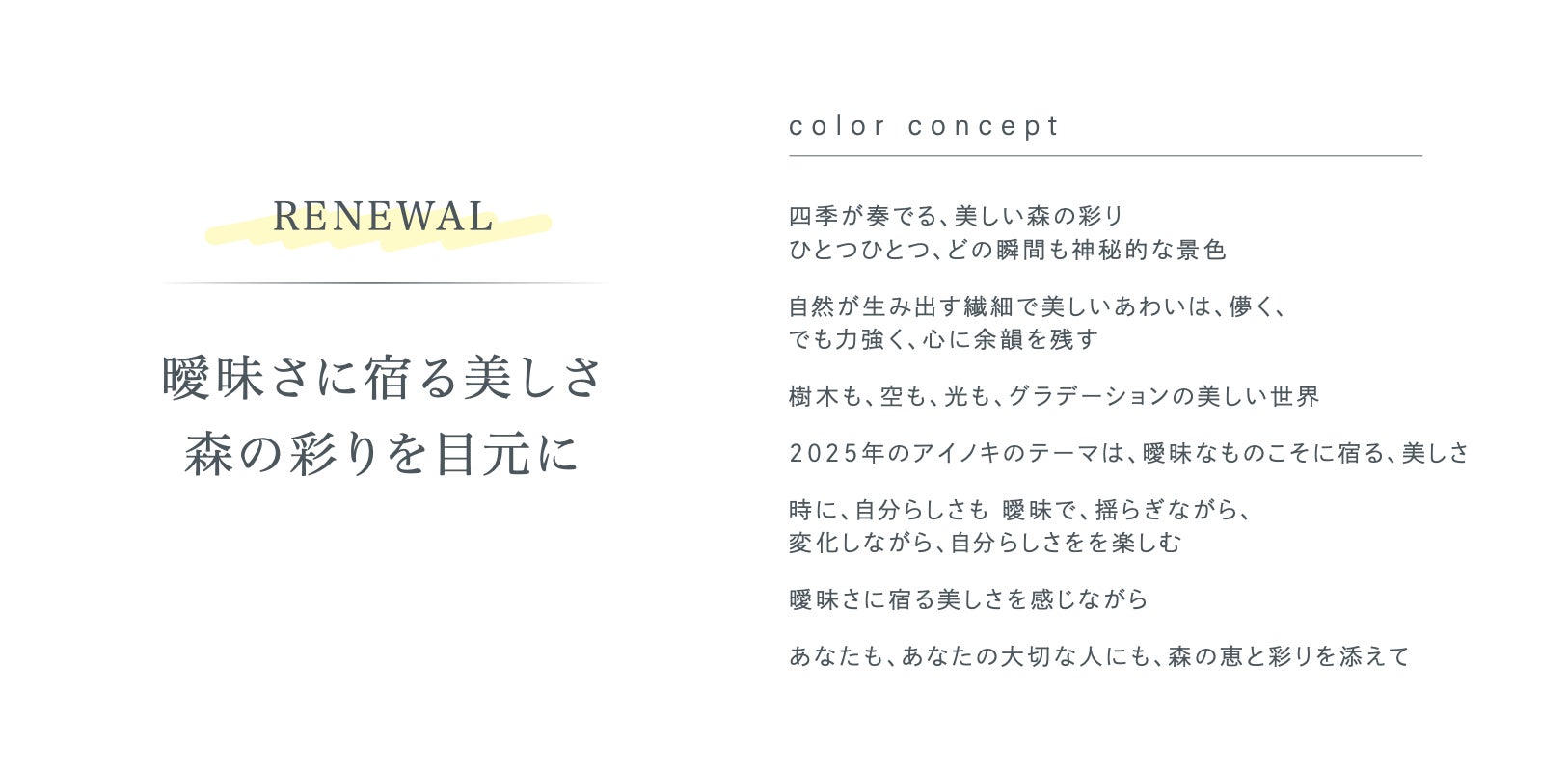 一人ひとりのきれいになりたい、という気持ちに寄り添うために生まれた日本品質のコスメティックブランド。ブランド名への想い “AI”は eyeとI、日本語で愛(AI)、 “KI” は日本語の木(KI)、気持ち(KIMOCHI)の頭文字。