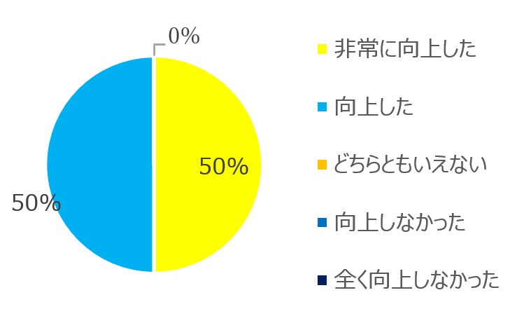 「非常に向上した」が50%、「向上した」が50%で、「向上を実感しなかった」という回答はゼロでした。 参加者全体がスキルの伸びを感じており、研修の実践性が高く評価されています。 詳細は以下の円グラフをご覧ください。