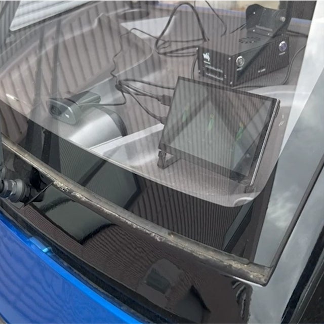 1. 自動運転車両にカメラや液晶ディスプレイなどのハードウェアを取り付けます。