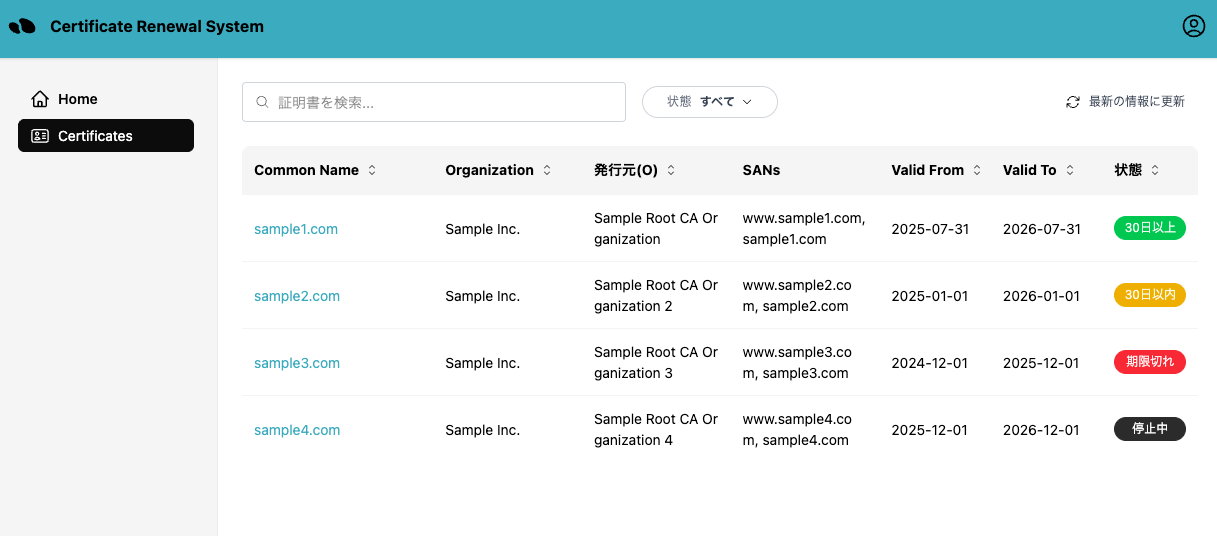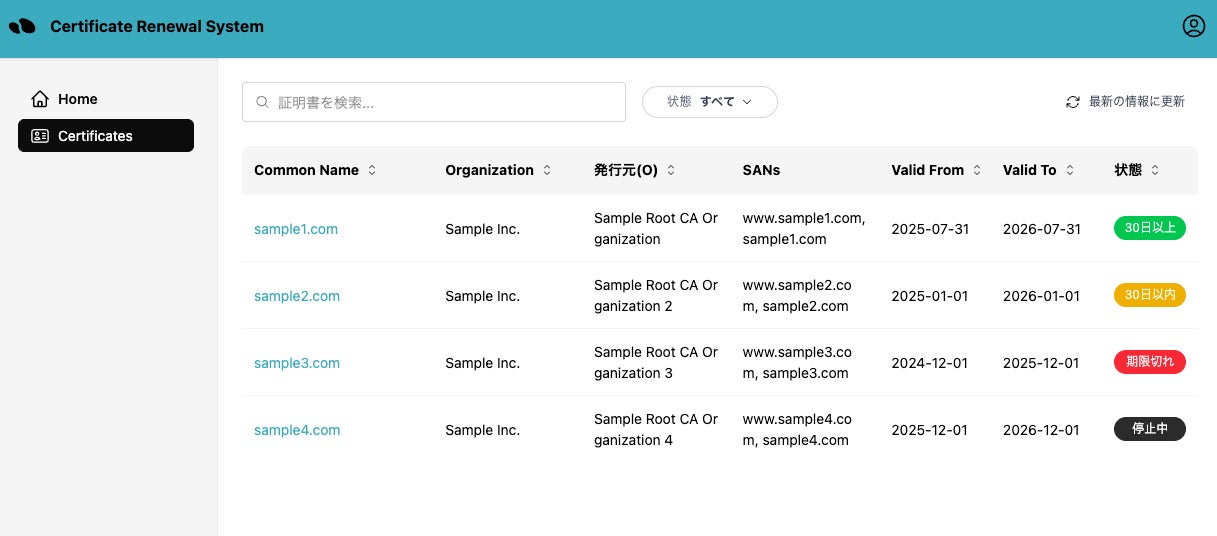 管理者はダッシュボードGUIにより、証明書の更新状況を一目で確認することができます。