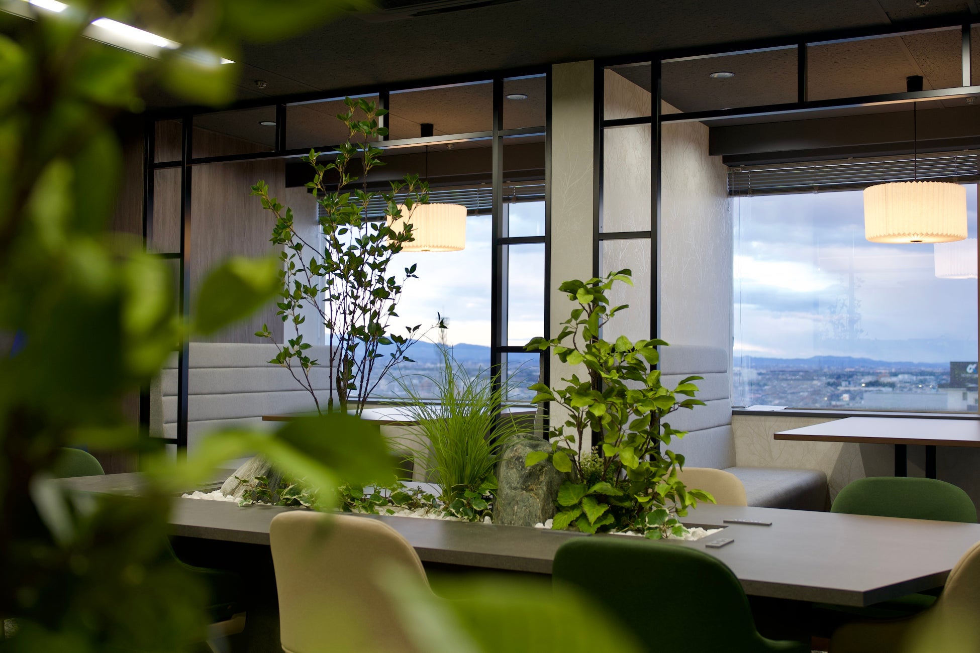 群馬の街並みを一望できる広々としたメインルームでは、フリーデスクを採用し、業務内容や気分に応じて自由に席を選べます。各席には角度調整可能なモニターを備え、柔軟な働き方を支援しています。