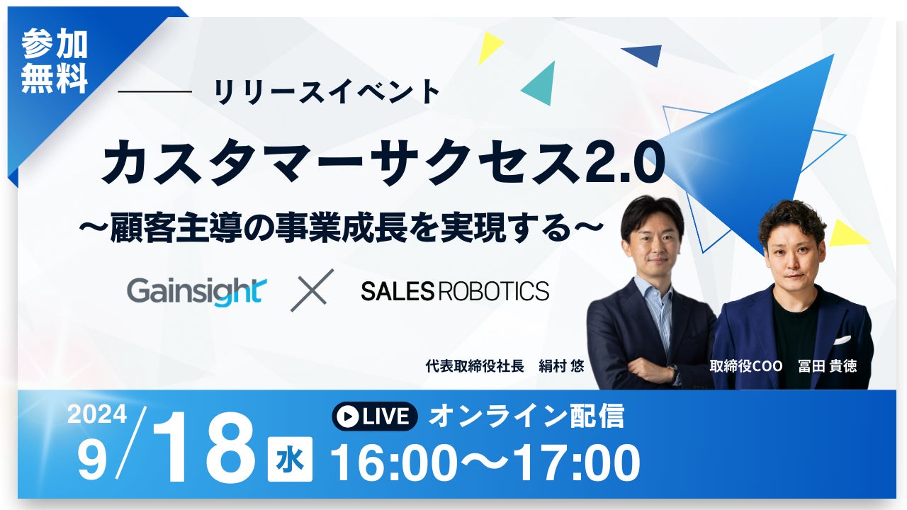 Gainsight株式会社(本社:東京都港区、代表取締役社長 絹村 悠、以下Gainsight)は株式会社ヒト・コミュニケーションズ・ホールディングス(本社:東京都豊島区、代表取締役社長 グループCEO:安井 豊明、証券コード:4433)のグループ会社である、SALES ROBOTICS株式会社(本社:東京都中央区 代表取締役社長 CEO有馬 康平 以下SALES ROBOTICS)と戦略パートナーシップを開始しました。