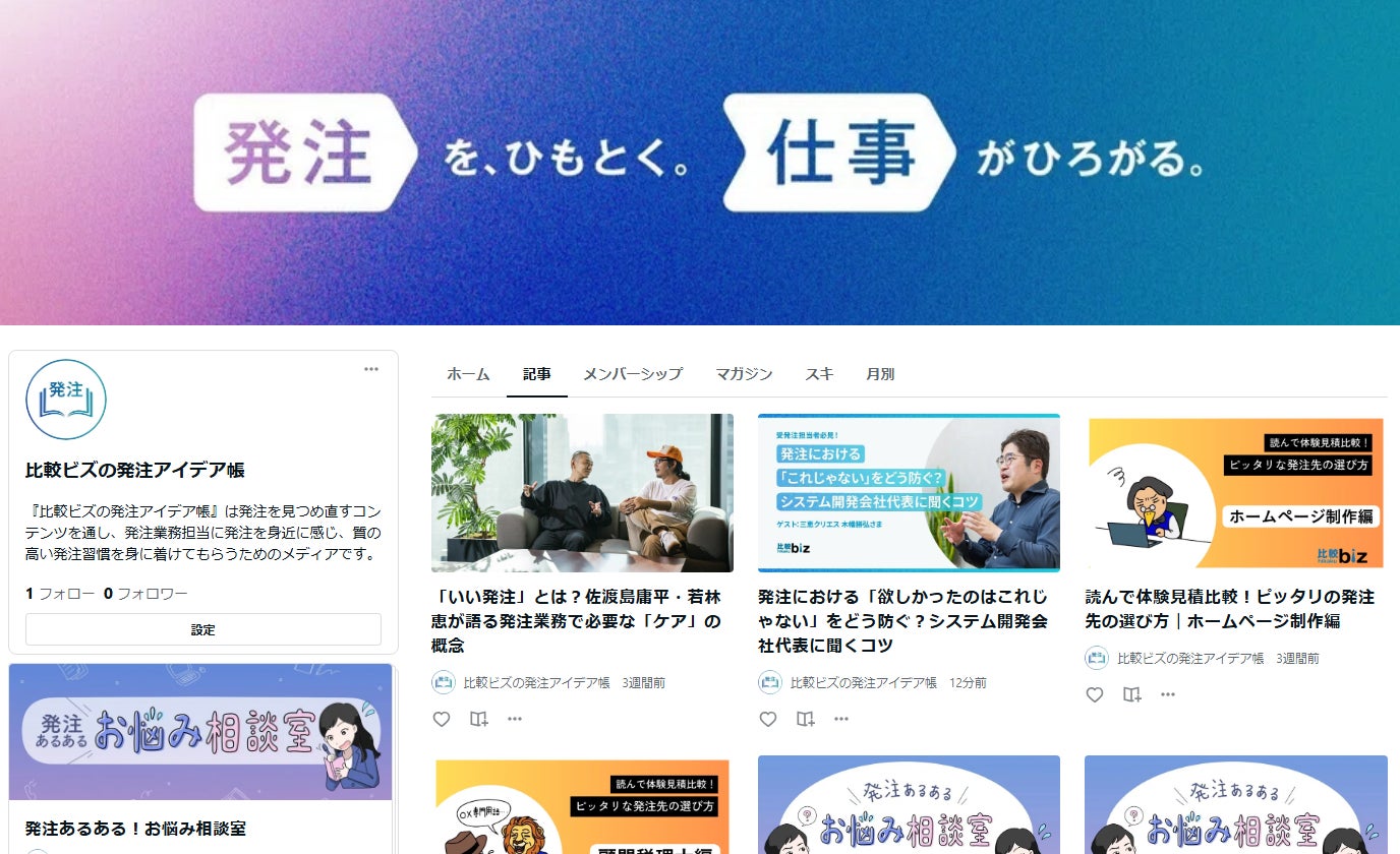 BtoB受発注者のマッチングサイト「比較ビズ」を運営する株式会社ワンズマインドは、noteメディア「比較ビズの発注アイデア帳」を、2025年1月16日にローンチ。
