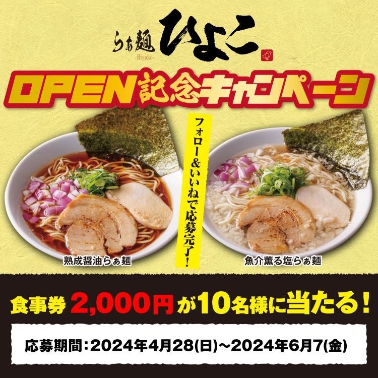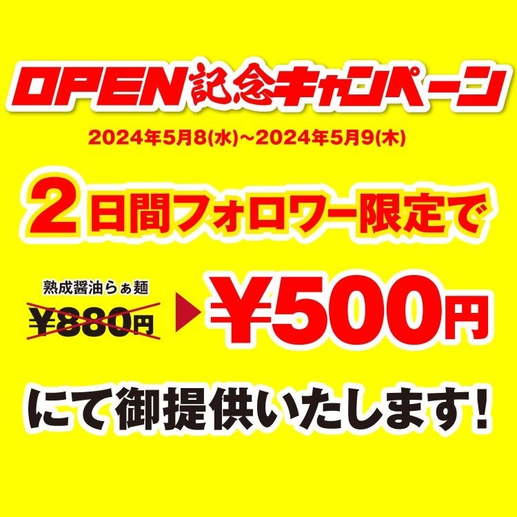 ①Instagram公式アカウントをフォローした方限定で、2024年5月8日(水)〜2024年5月9日(木)の2日間で「熟成醤油らぁ麺(¥880)」をワンコイン500円でプレゼント!
