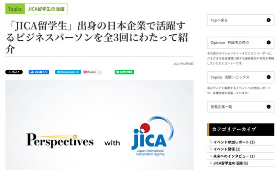 Perspectivesではこの度、JICA(独立行政法人国際協力機構)と連携し、日本企業で活躍する元JICA留学生を紹介する記事を3回にわたって公開することとなりました。本メディアはこれまで、事業を通じて社会課題を解決する日本企業のプロジェクトを、そのキーパーソンの志や意欲、情熱などとあわせて掲載してきました。JICA様にも当メディアの活動に共感いただき、「JICA留学生」出身のビジネスパーソンの活躍を2024年12月から紹介していきます。