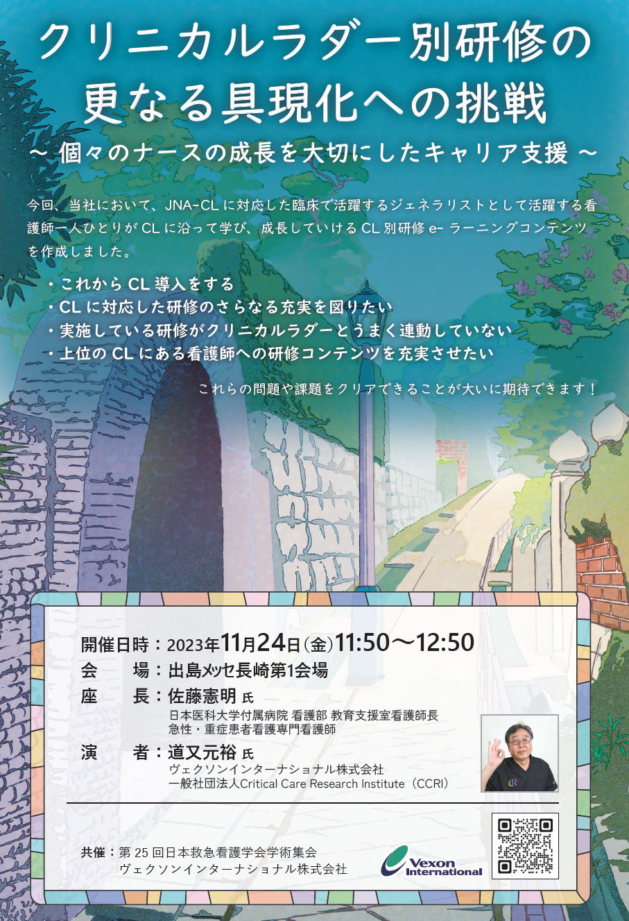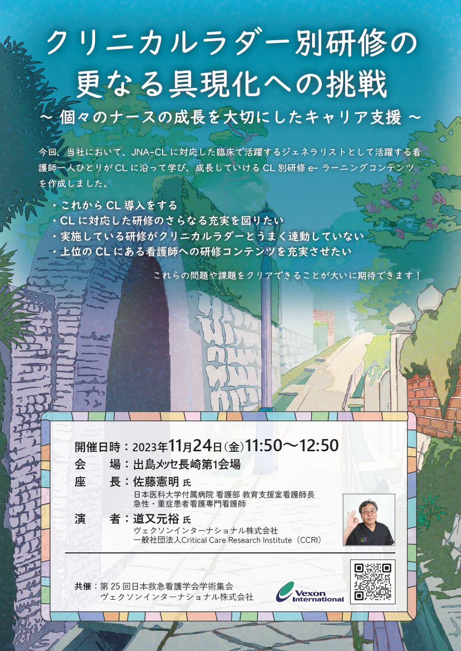 11月24日(金)11:50~12:50のランチョンセミナーでは『クリニカルラダー別研修の更なる具現化への挑戦 ~ 個々のナースの成長を大切にしたキャリア支援 〜』をテーマに、日本医科大学付属病院 看護部 教育支援室看護師長 急性・重症患者看護専門看護師 佐藤 憲明氏を座長にお迎えし、演者としてヴェクソンインターナショナル株式会社 看護企画部 部長 道又 元裕が講演いたします。