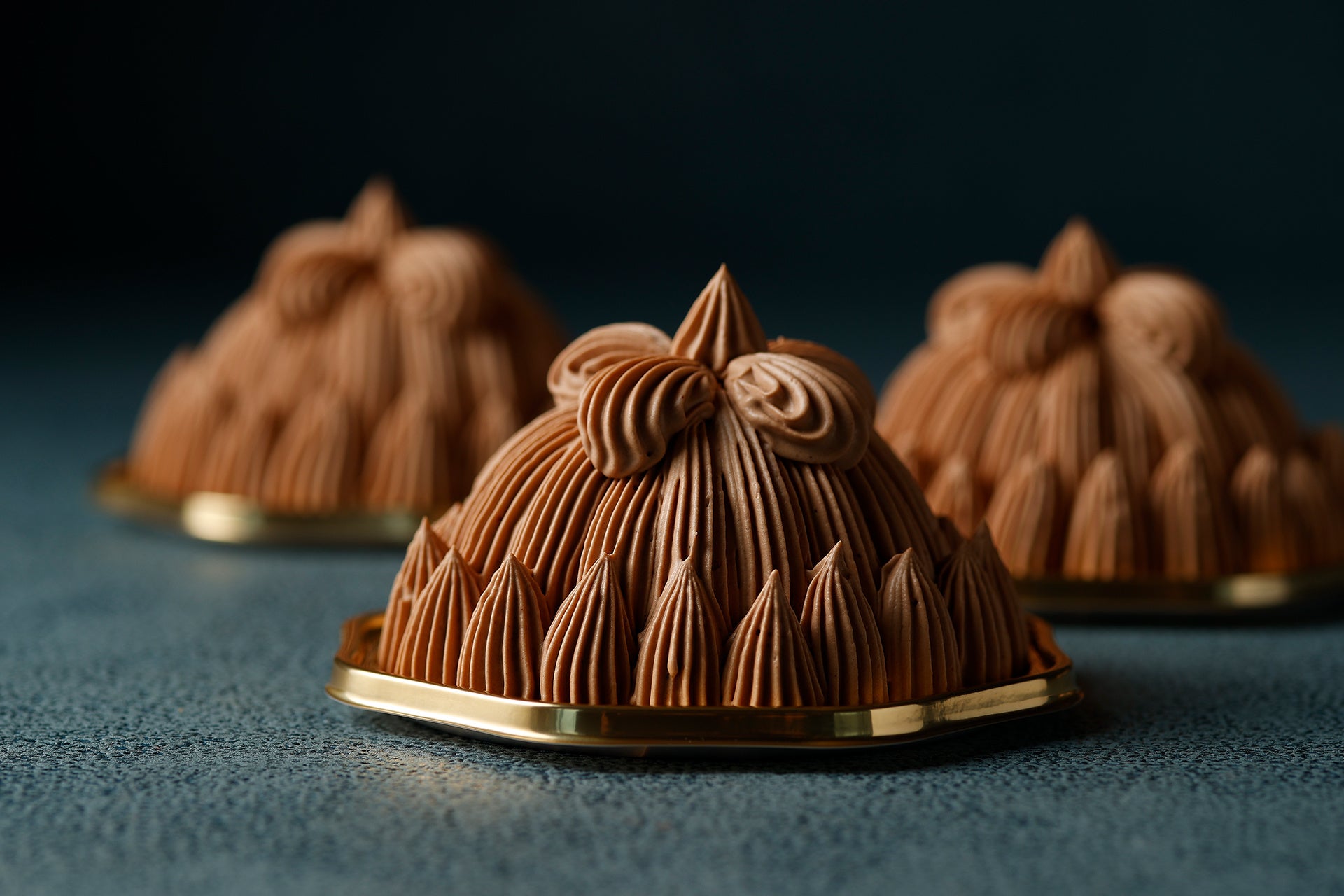 マロンシャンテリーは約70年の歴史を持つ、東京會舘初代製菓長 勝目清鷹が考案したモンブランです。冬期限定のプレミアム商品では、フランス産の栗にマロングラッセのペーストを加えたフィリングと、濃厚なチョコレートのガナッシュを味わっていただけます。周囲を飾り付けたショコラクリームは、ビターな風味のフランス産ショコラを使用。甘さと苦みのバランスのよい大人のモンブランに仕上げました。