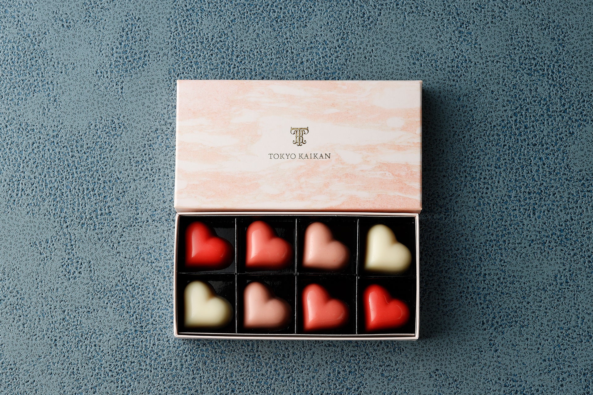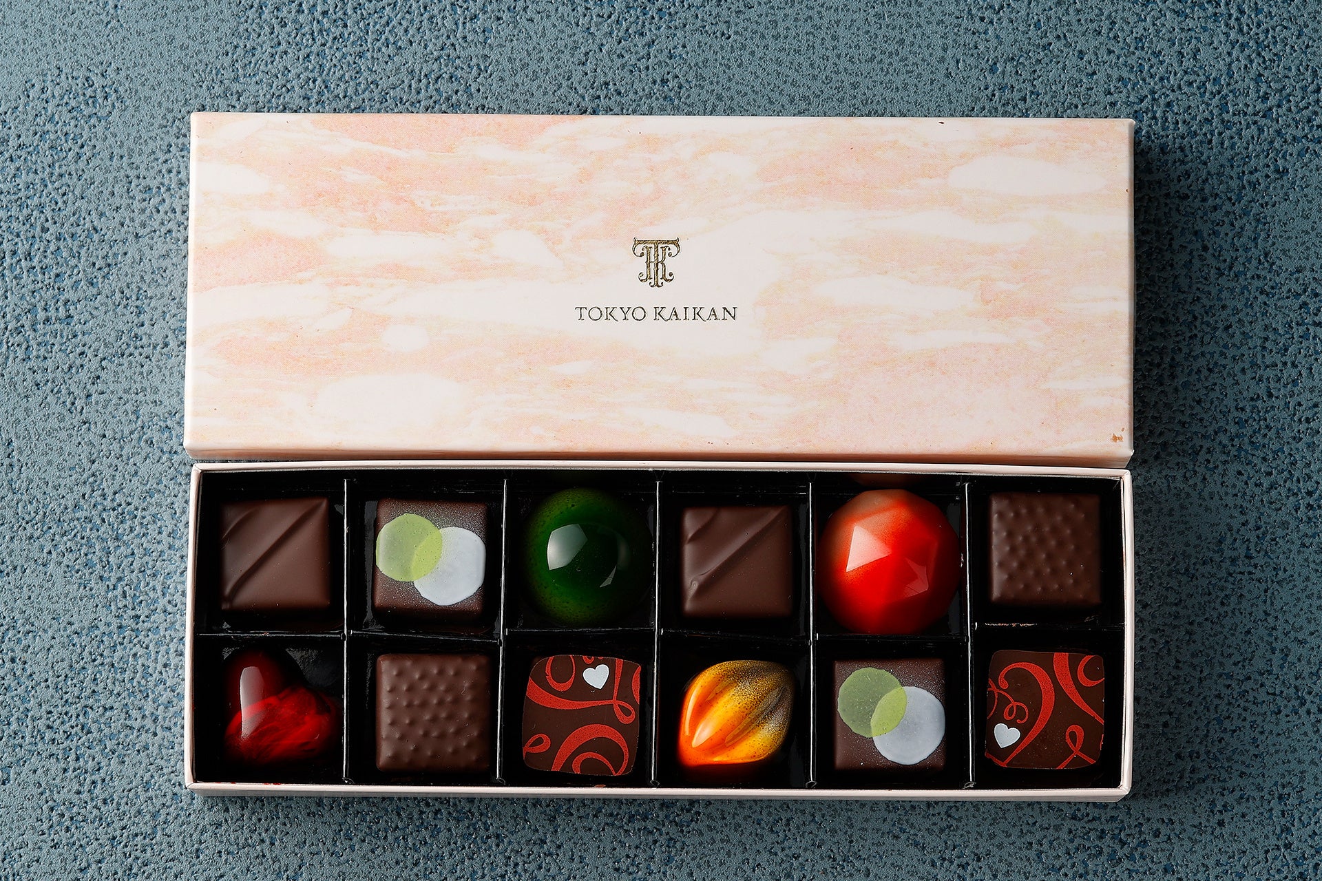 <内容>1.ガナッシュ ノワール:ハイカカオのチョコレートを使用、東京會舘定番の一品/2.ピスタチオ:ピスタチオの香ばしさとコクが広がるガナッシュ/3.キャラメルブールサレ:リッチな塩バターキャラメルボンボン、東京會舘定番の一品/4.スペキュロス:シナモンやクローブなどのスパイスとまろやかなホワイトチョコレートの組み合わせ/5.プラリネ:アーモンドとヘーゼルナッツのプラリネ、東京會舘定番の一品/6.カシスワイン:赤ワインと甘酸っぱいカシスのハート形のガナッシュ/7.グランマルニエ:オレンジピールが入ったグランマルニエのガナッシュ/8.温州みかん:フレッシュな温州みかんから作る爽やかな柑橘のガナッシュ