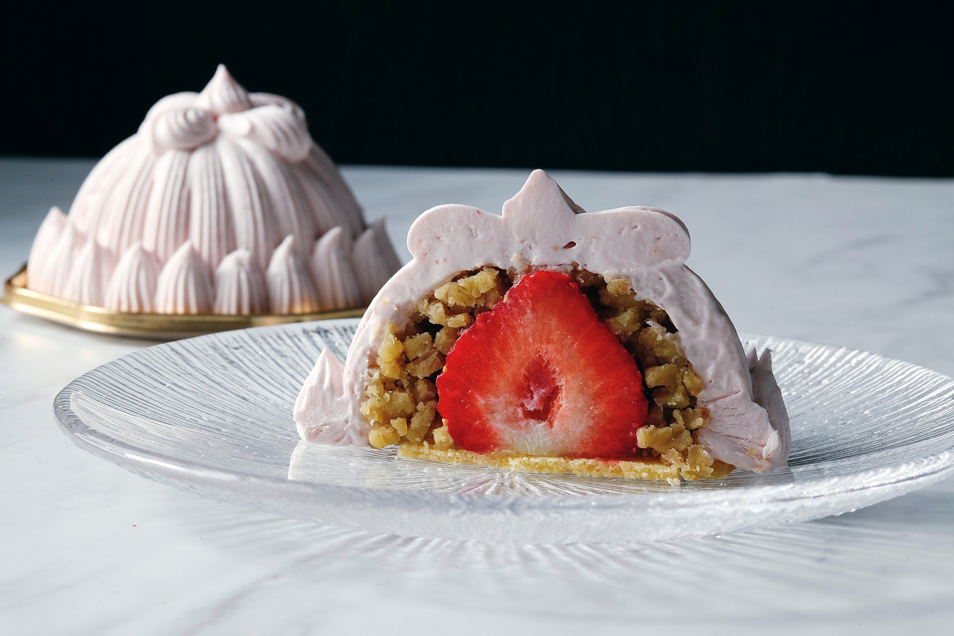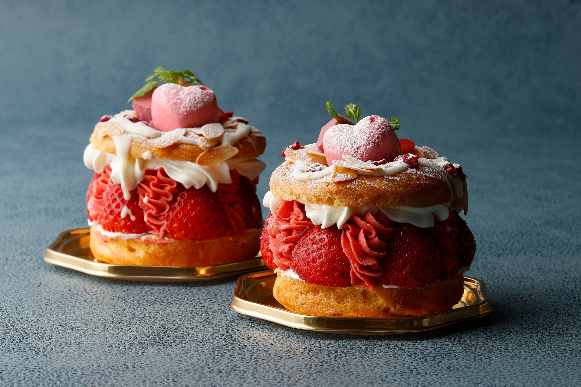 「パリブレスト苺」をバレンタインデー向けにさらに華やかにデコレーションした期間限定のスイーツです。生地の周囲にカットした「あまおう」と、ルビーショコラで作ったピンク色のショコラクリームを飾り付けたほか、ルビーショコラのガナッシュをトッピング。さらに、愛らしいハート形のラズベリー味のギモーヴも添えました。「あまおう」は約3個を使用しており、ご褒美スイーツとして、またシェアしてお楽しみいただくのにもおすすめです。
