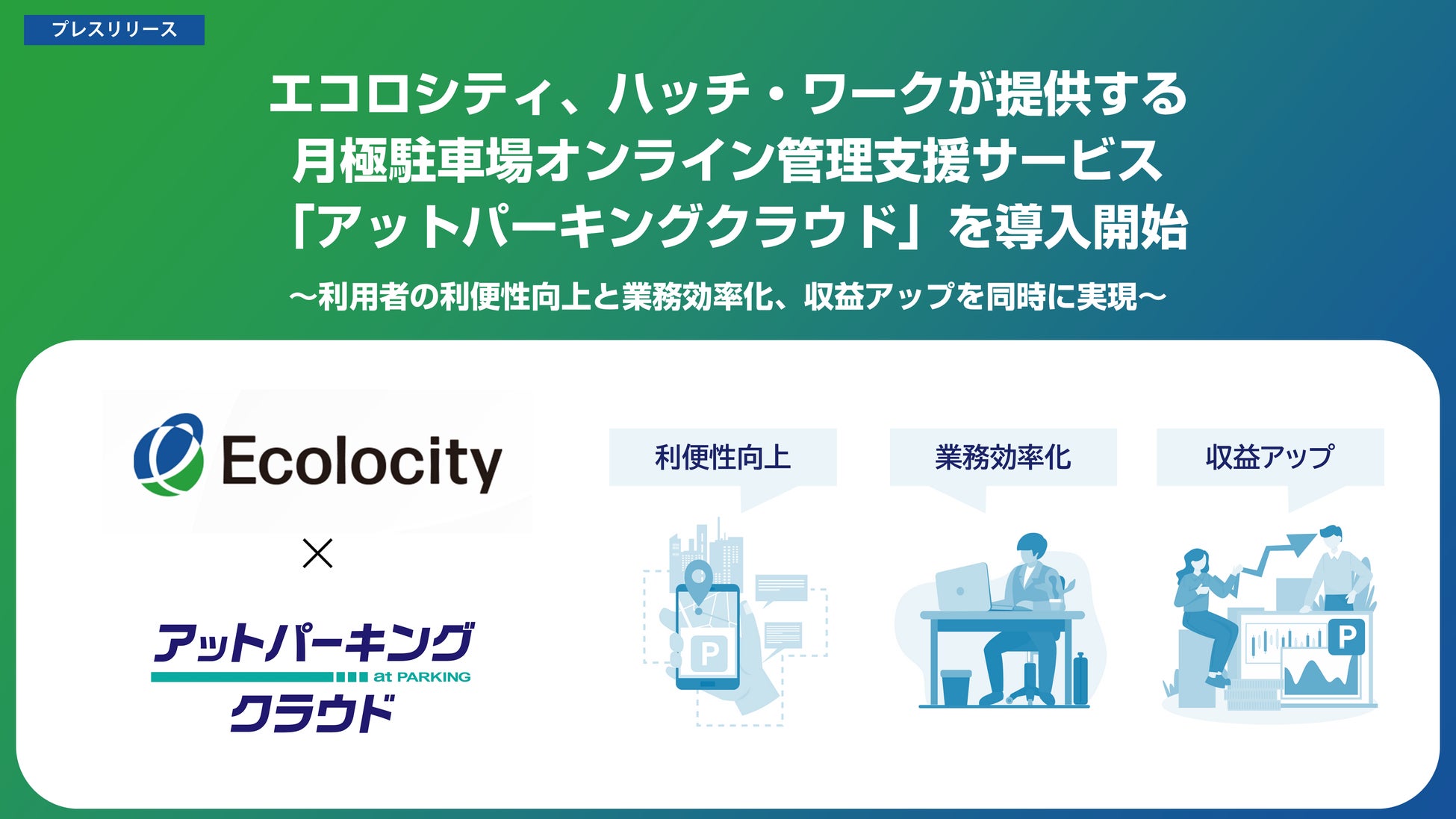 エコロシティ株式会社(本社:東京都港区、代表取締役社長:山本麻理、以下「エコロシティ」)は、株式会社ハッチ・ワーク(本社:東京都港区、代表取締役社長:増田知平、以下「ハッチ・ワーク」)が提供する月極駐車場オンライン管理支援サービス「アットパーキングクラウド」の導入を開始いたしました。