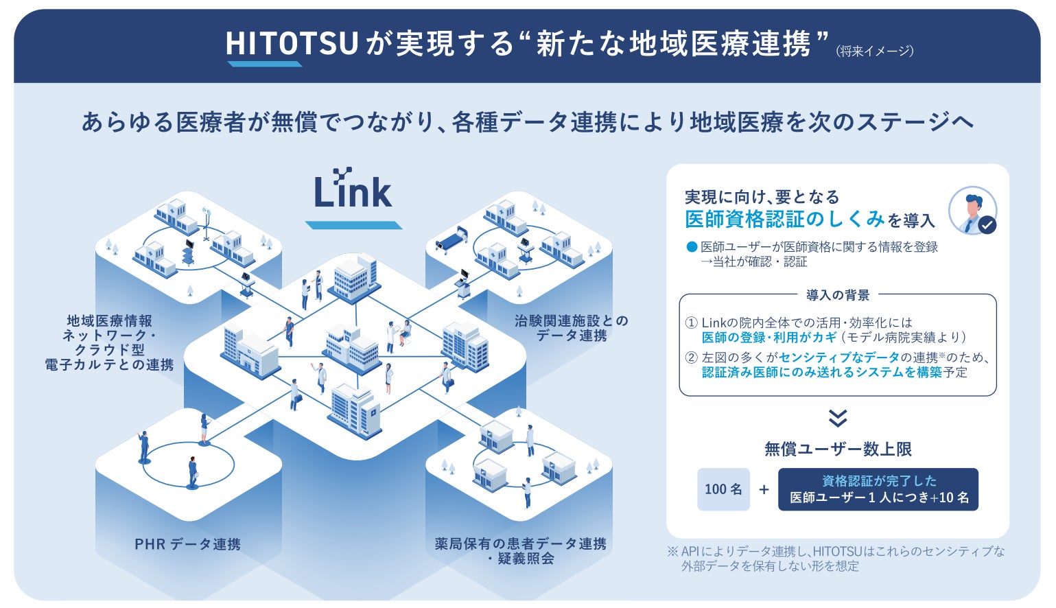 「医療にかかわる人々を、ひとつに」というビジョンのもと、医療業界横断DXを推進するHITOTSU株式会社(代表取締役CEO 佐藤 公彦、以下「当社」)は、全国270以上の医療機関で導入されている医療DXチャット“Link”について、あらゆる医療機関で全スタッフ分、チャットを無償で利用できるよう、11月にプランを刷新します。これにより、病院、クリニック、保険薬局、介護施設など、すべての医療者がつながり、患者情報を含む院内・施設間のやり取りを手軽・安心・安全に行える基盤をさらに強力に広げてまいります。