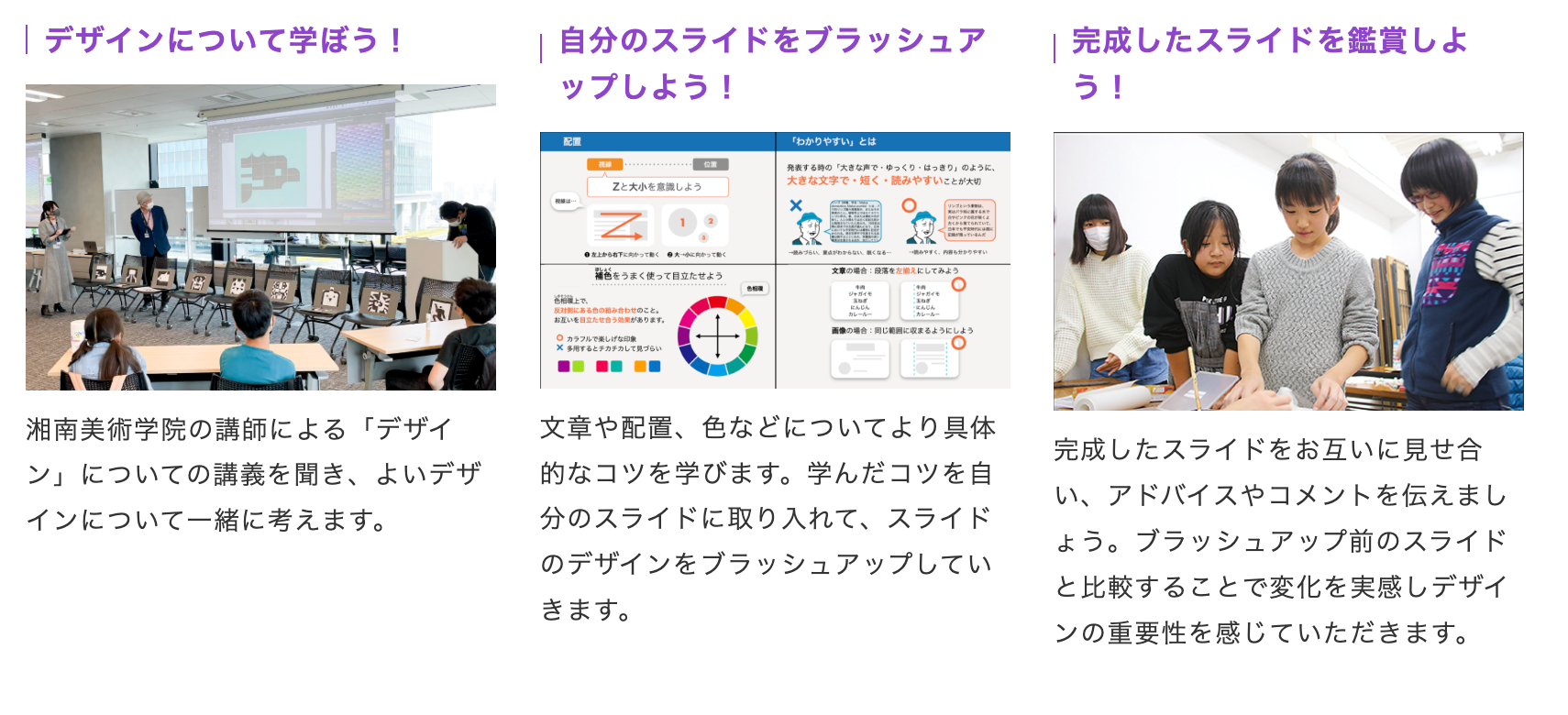 湘南美術学院の講師による、デザインの基本的な考え方を学ぶ特別講義を受け、スライドにおける文字の配置、色使いなどについて具体的なコツを学び、実際に自身の作成したスライドのブラッシュアップまで行います。