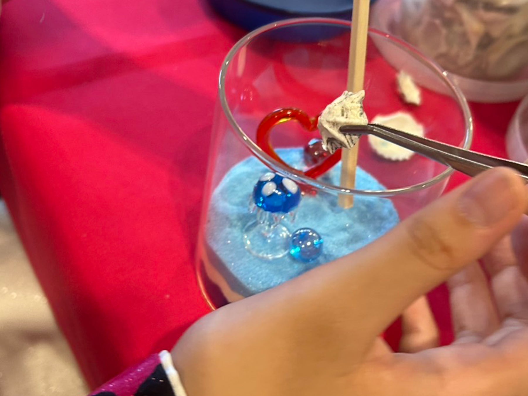 浮世絵展の余韻を“形”として残せる人気の体験型企画。透明なジェルに、貝殻やビーズ、花モチーフなどを詰めて自分だけのキャンドルを作れます。