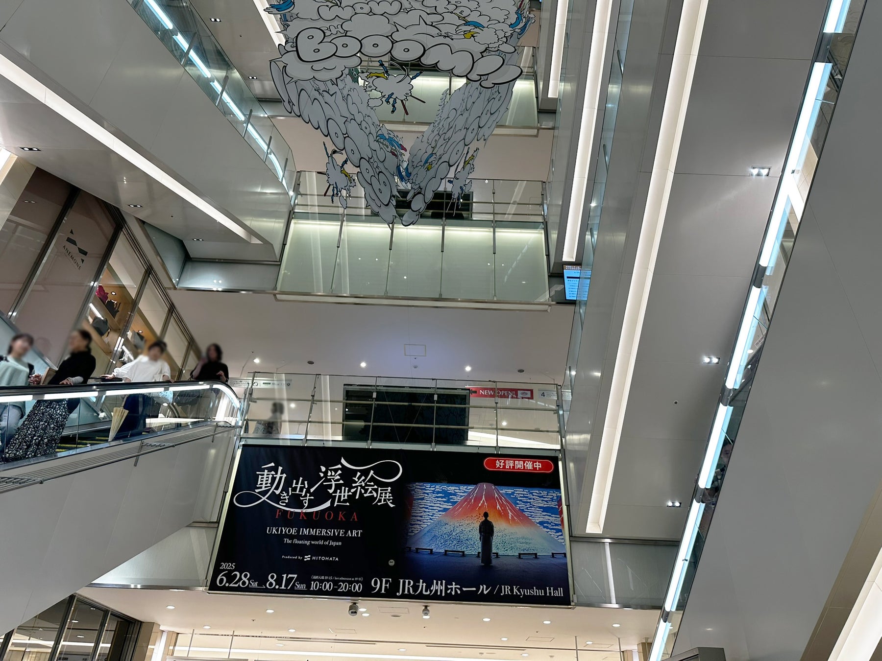 JR博多シティ館内では、1階から9階まで『動き出す浮世絵展 FUKUOKA』の装飾が施されており、エスカレーターや館内サインに沿って、迷うことなく会場(9階・JR九州ホール)までお越しいただけます。展覧会の世界観を道中からお楽しみください。