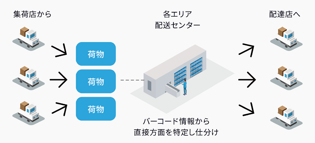 宅配業界において、各営業所には毎⽇⼤量の荷物が発着しています。各営業所が集荷したのち、そのまま⽬的住所へ届くのではなく、⼤まかに別のエリア・⽅⾯に向けて仕分けられ、エリアセンターに到着し、そこから営業所へ渡り、最終的に個々の⽬的地へ配達されます。