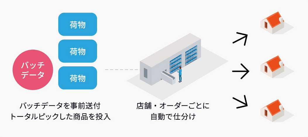 事前に予定データを送付。それをベースにトータルピックしてきた商品をオムニソーターで仕分けます。B2B利⽤での店舗への仕分けやB2C利⽤でオーダーごとの仕分けに向いています。