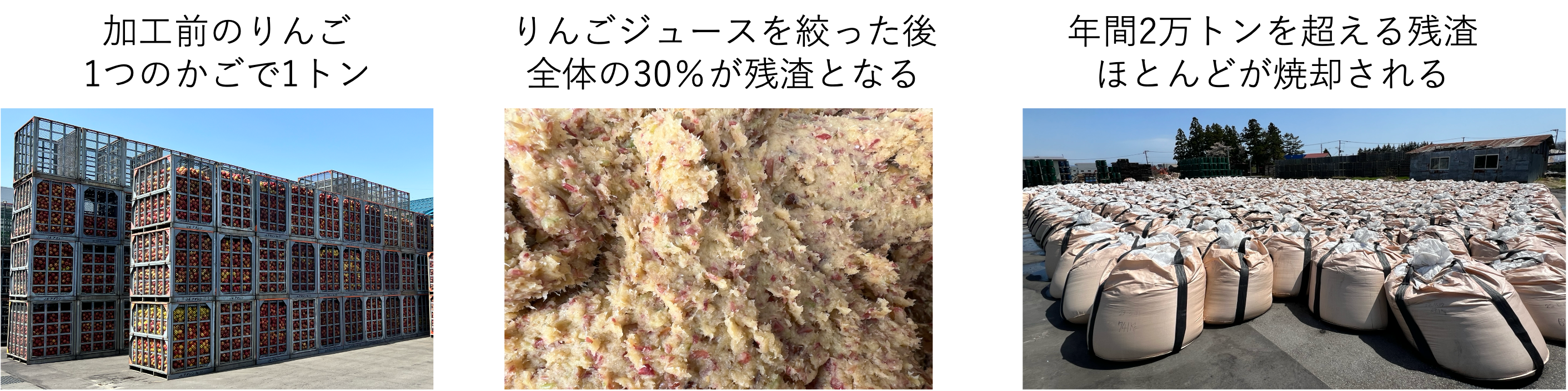 しかし近年は、りんご農家の高齢化や労働力不足による栽培面積の減少に加え、りんごジュースを絞った後の残渣の処理にかかる環境面・費用面への負担が大きな課題となっています。