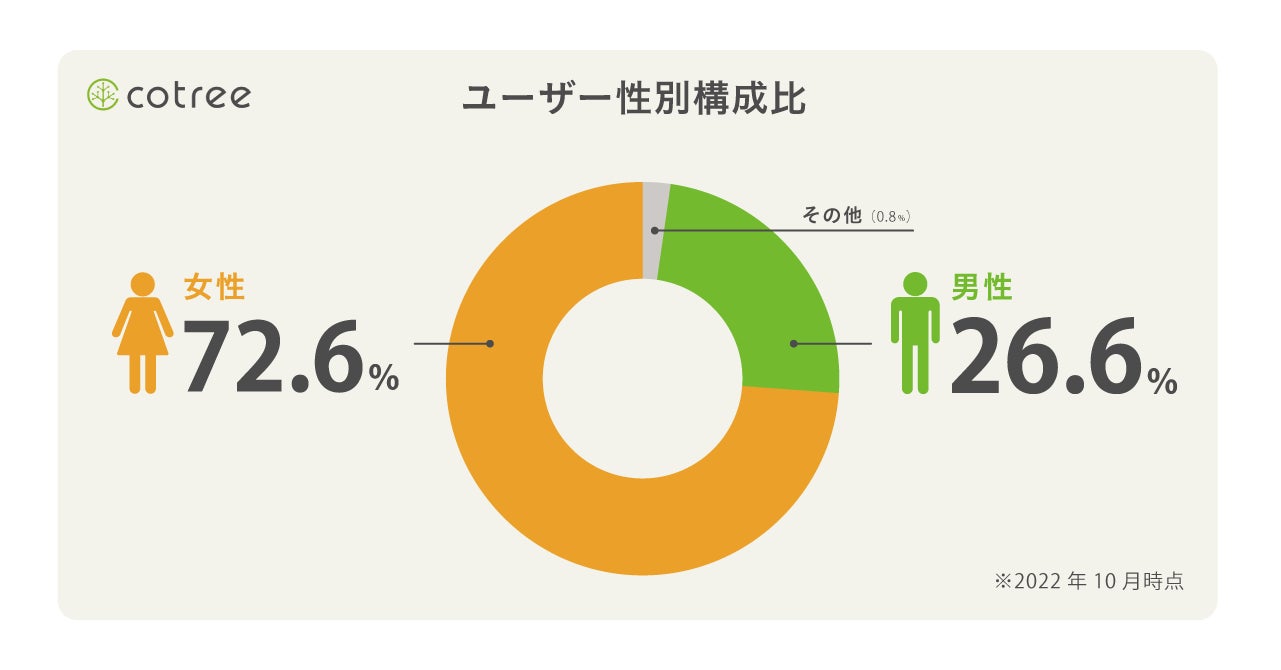 cotreeのオンラインカウンセリングは様々な方にご利用いただいていますが、特に20~30代の利用が多いことが特徴です。また、性別については女性の利用が多く、70%以上が女性の利用です。