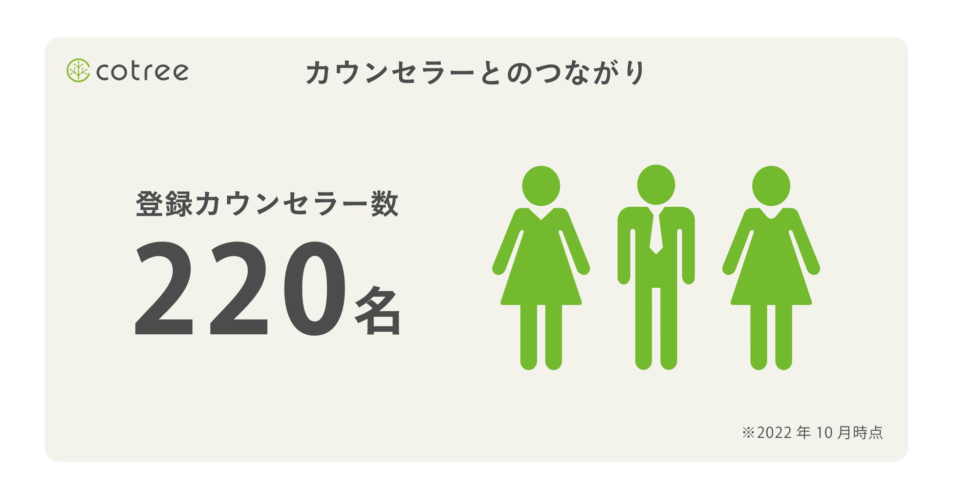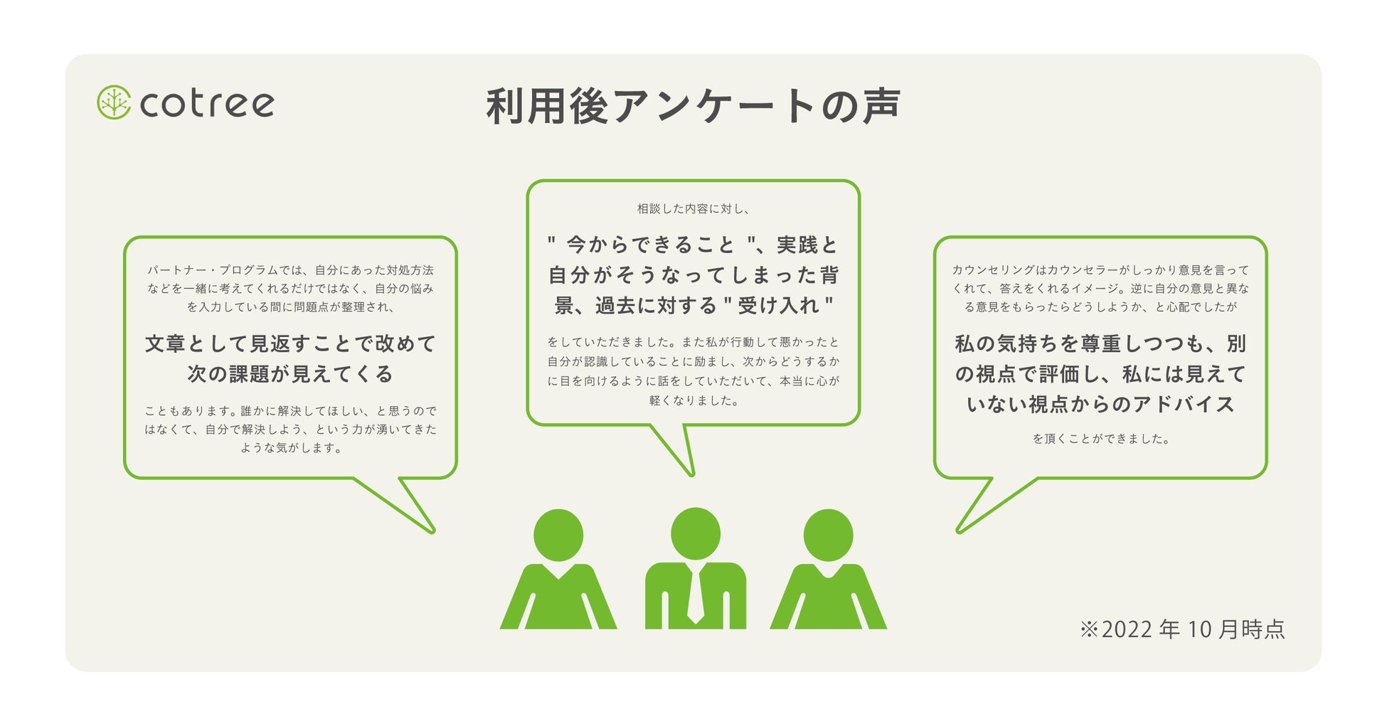 cotreeでは、企業向けに従業員への福利厚生として、また大学向けに学生のオンライン相談窓口としてご活用いただけるよう、「cotree法人・団体向けプラン」(https://corp.cotree.jp/)や「cotree大学向けプラン」(https://corp.cotree.jp/university)を用意し、法人の皆さまともつながりを持ってきました。