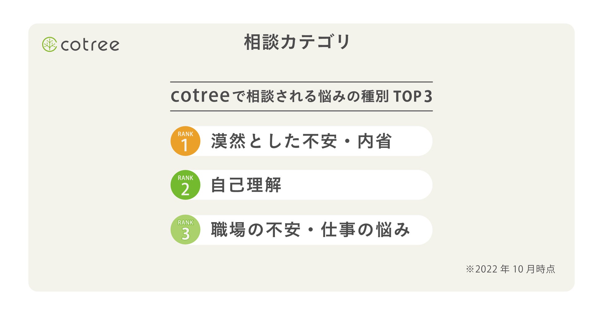 cotreeで寄り添ってきた不安や悩みのカテゴリーは、「漠然とした不安」や「自己理解」という答えがない悩みや、「職場の不安・仕事の悩み」という日常生活の中で相談相手が見つけづらい悩みが多い傾向にあります。