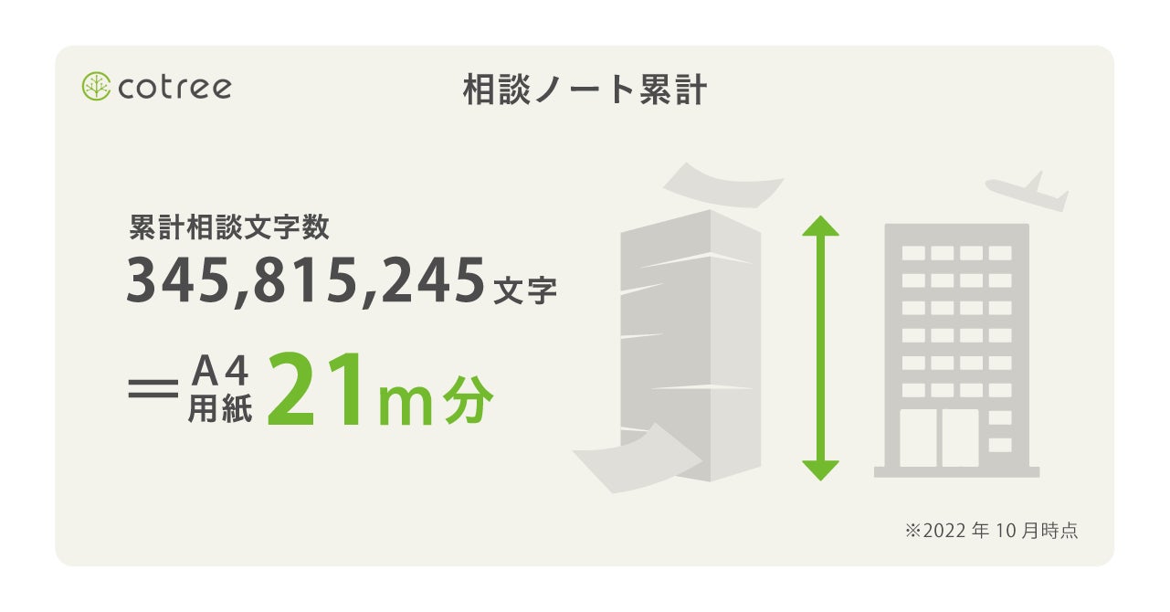 これまでcotreeを通じて行われたオンラインカウンセリングの相談件数は、「書くカウンセリング」、「話すカウンセリング」の合計で11万件を超えています。