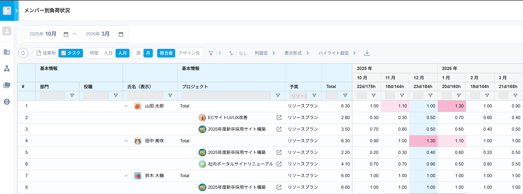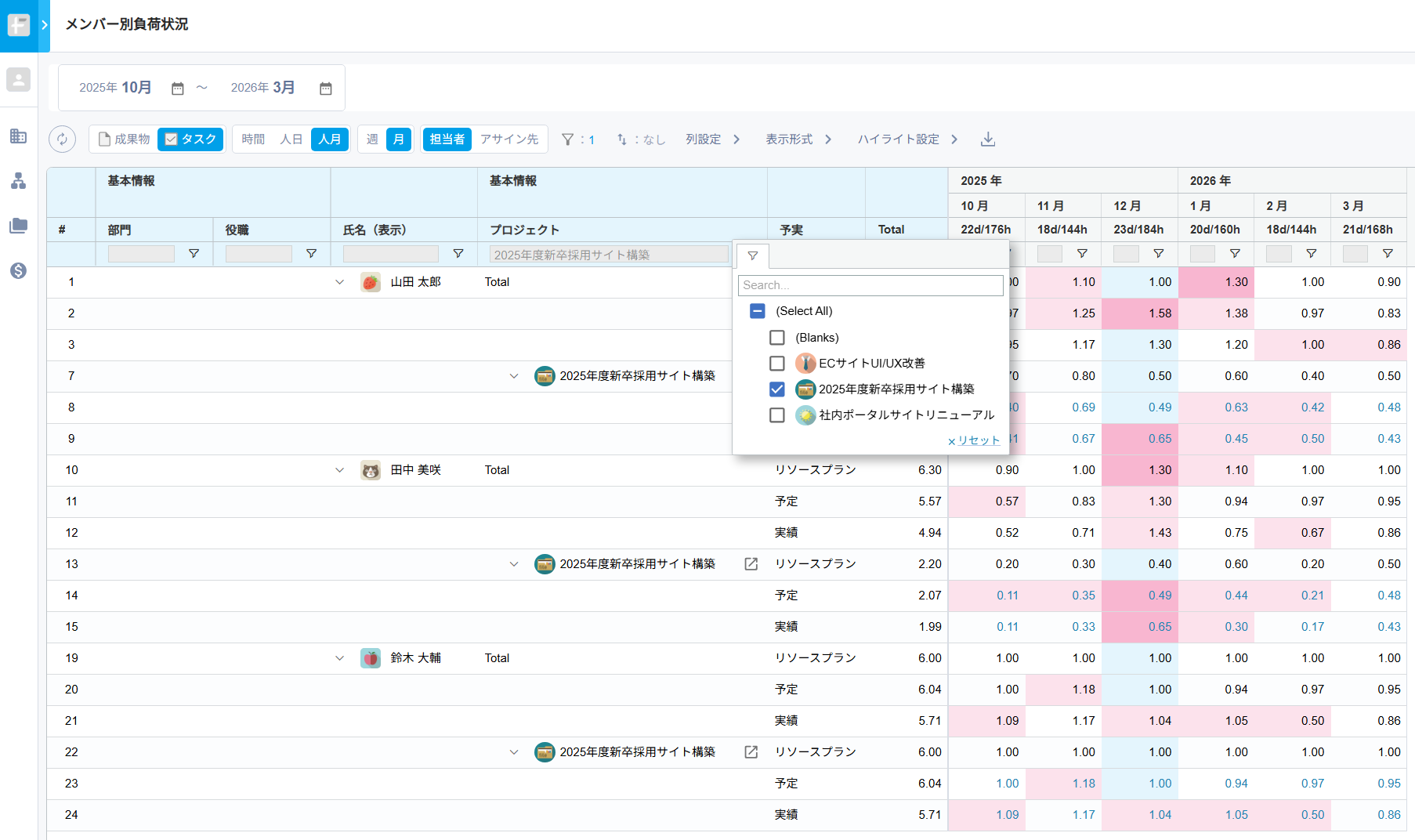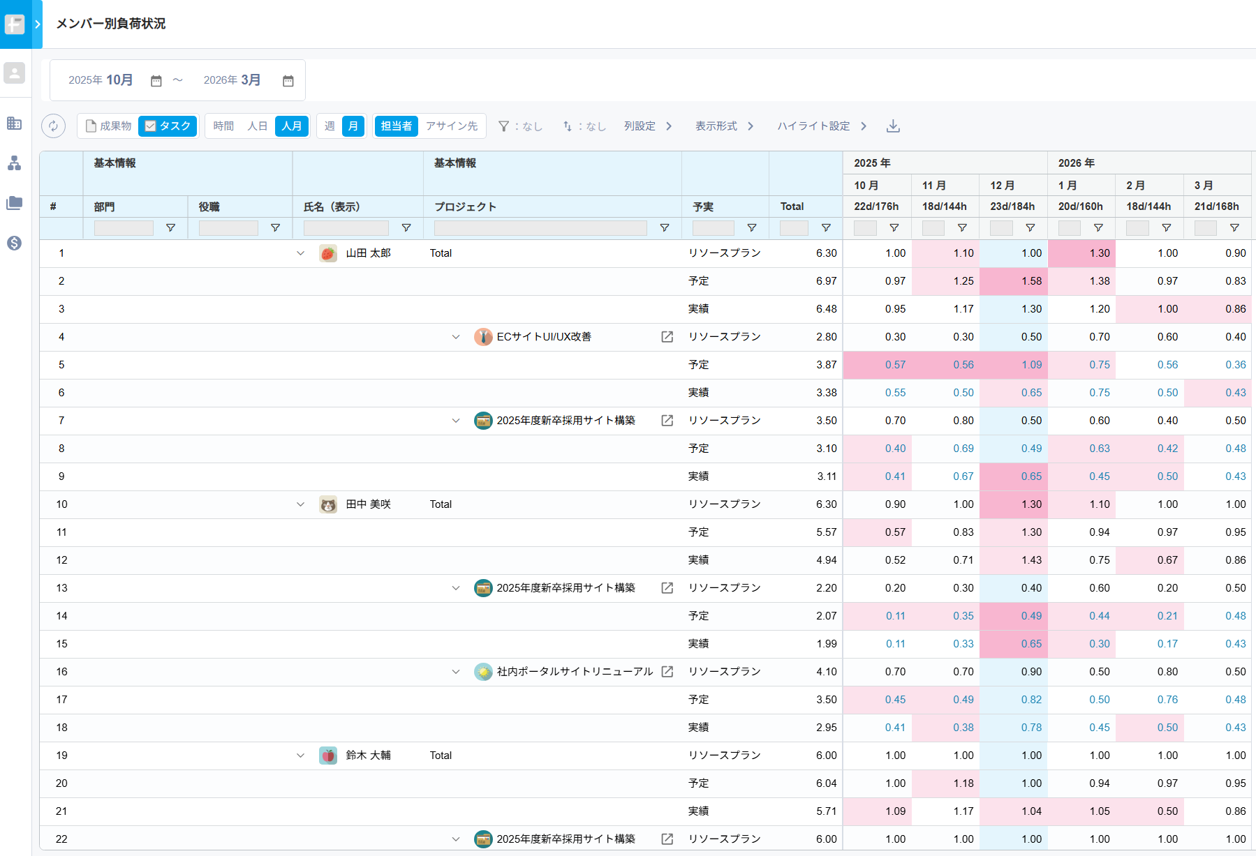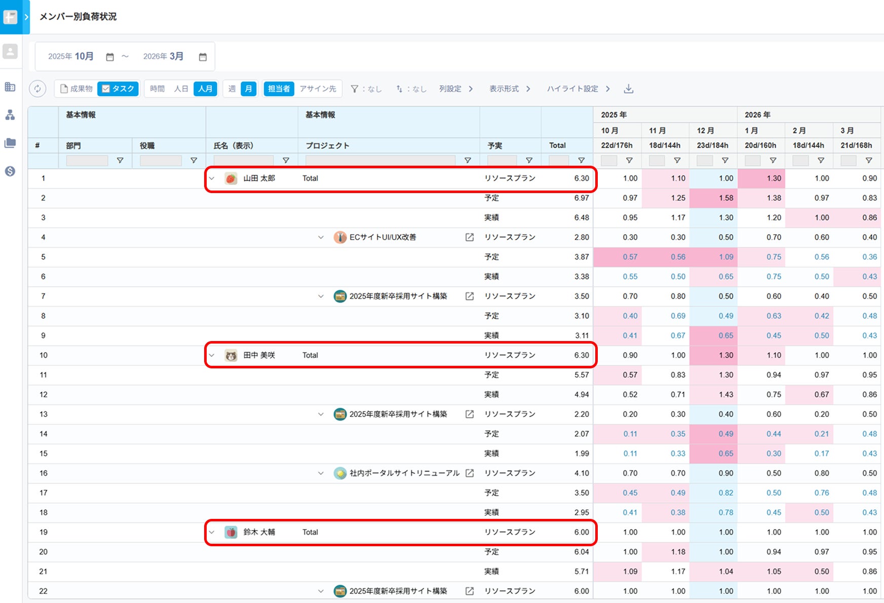 メンバーごとに全プロジェクトの予定工数・実績工数・リソースプランを集約し、横断的に稼働状況を一覧で可視化します。