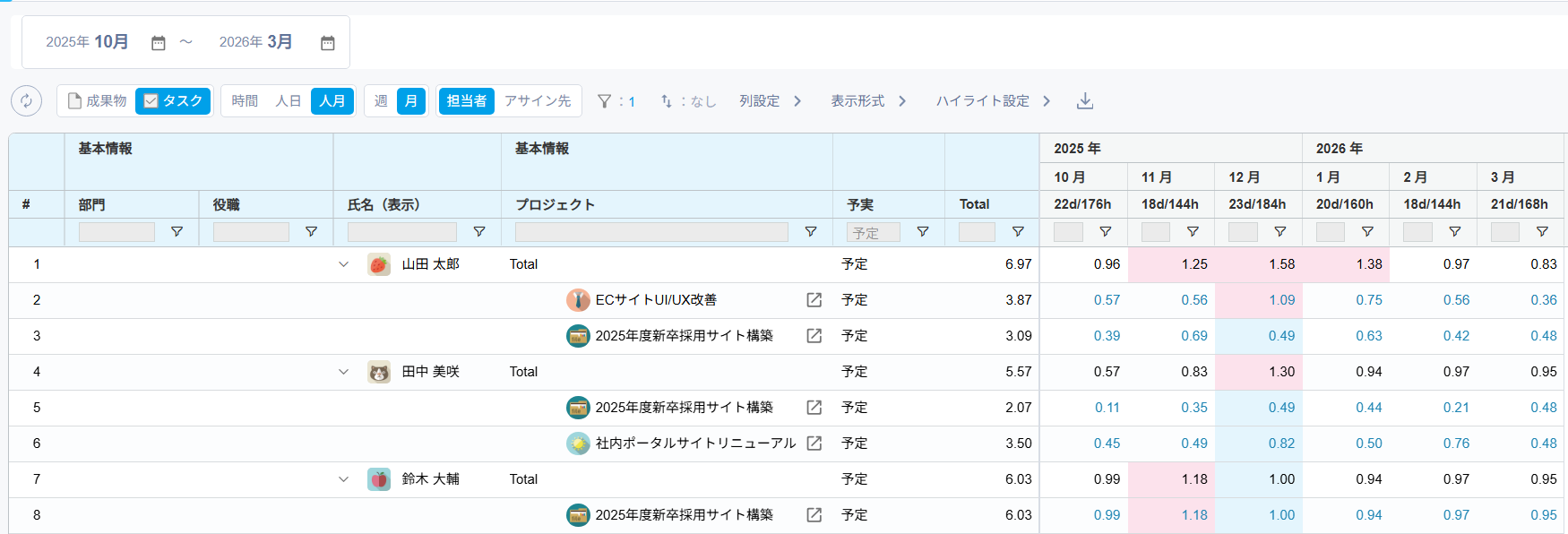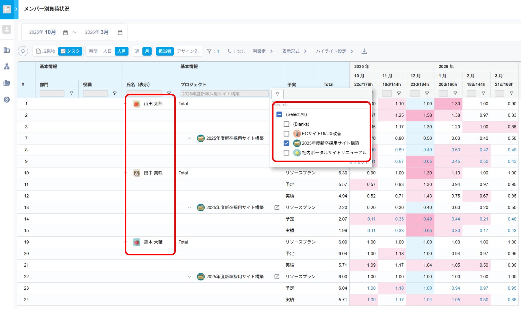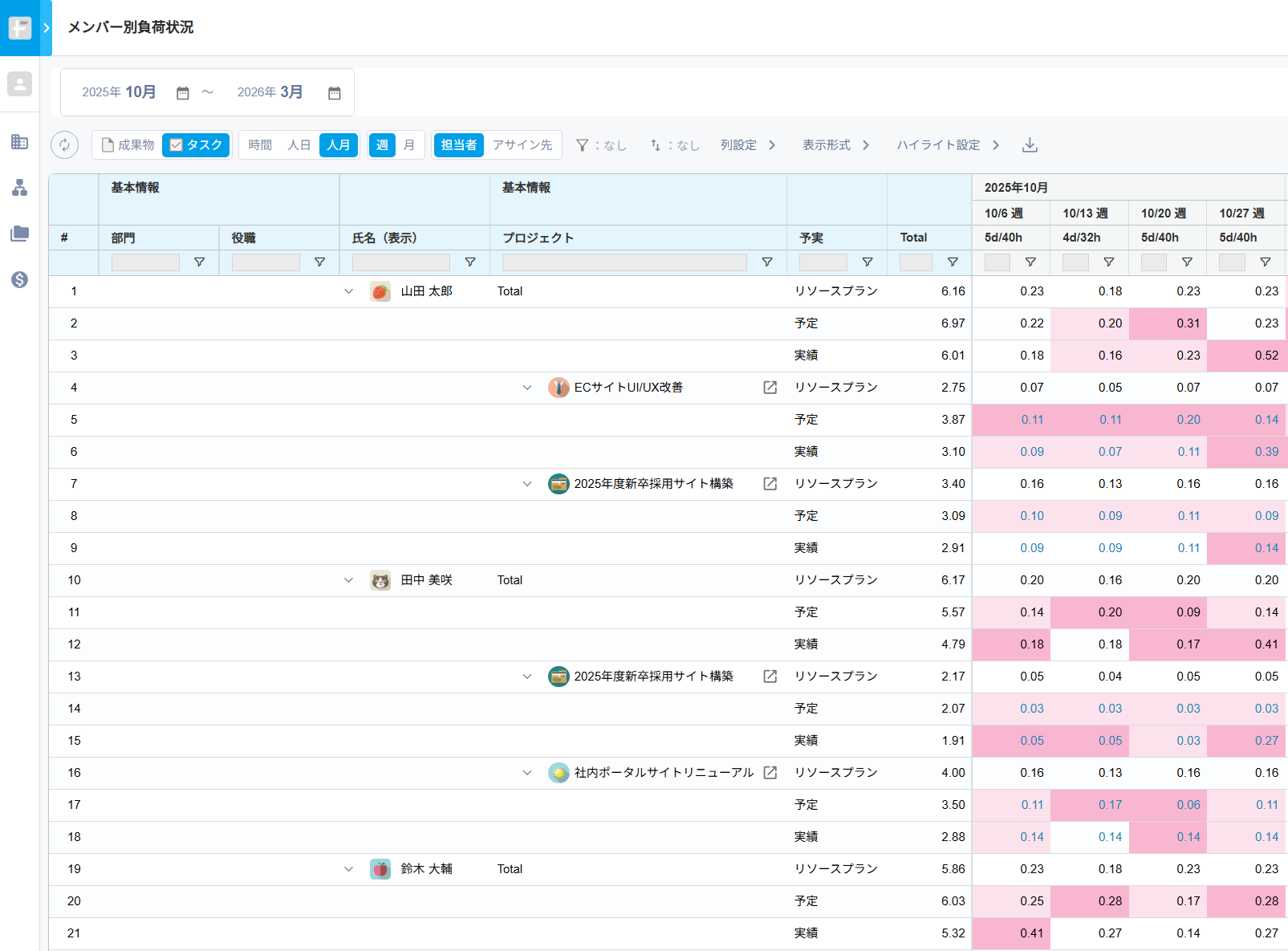 メンバーごとに全プロジェクトの予定工数・実績工数・リソースプランを集約し、横断的に稼働状況を一覧で可視化します。