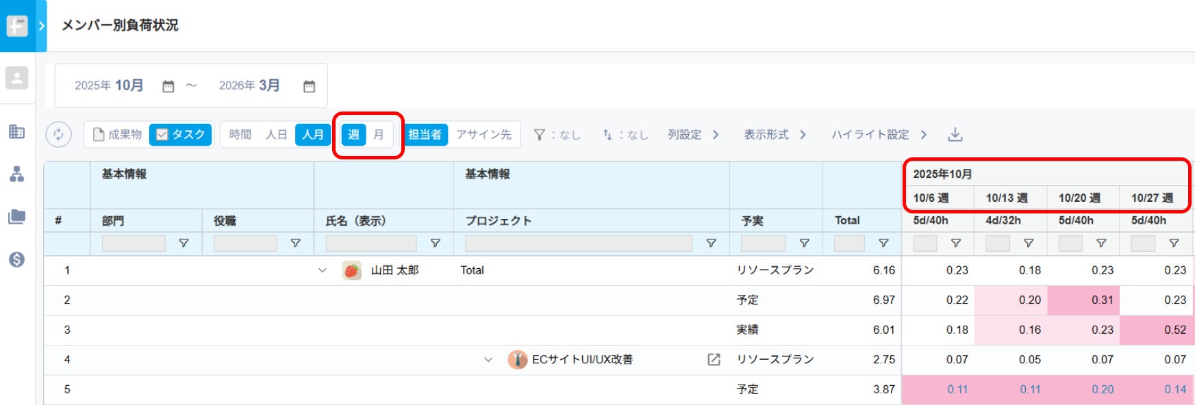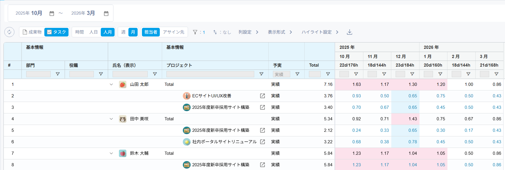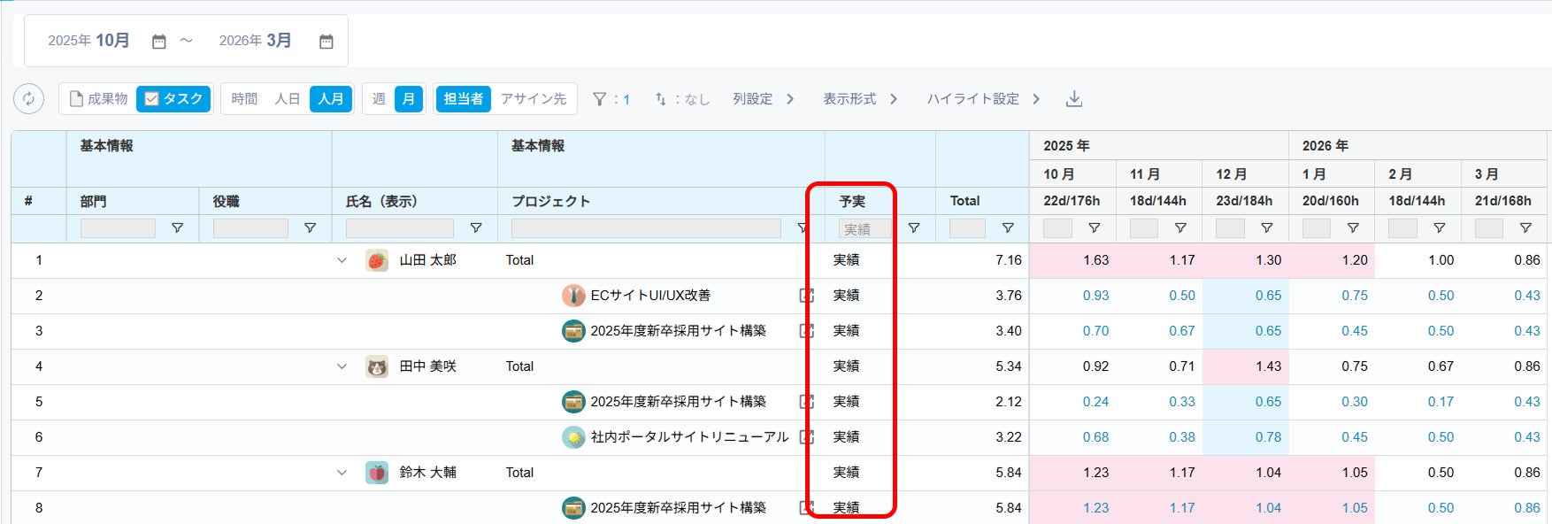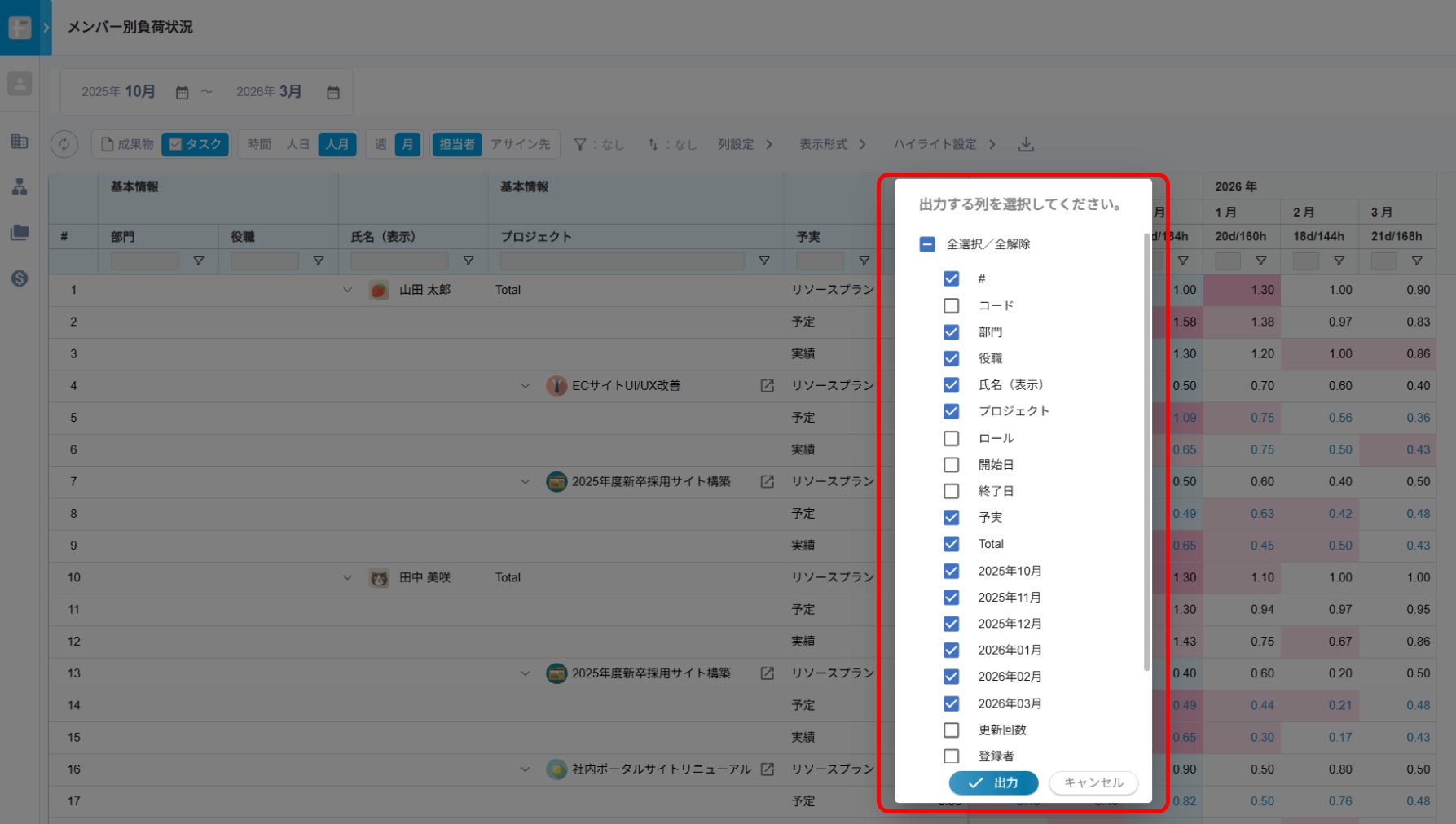 メンバーごとに全プロジェクトの予定工数・実績工数・リソースプランを集約し、横断的に稼働状況を一覧で可視化します。